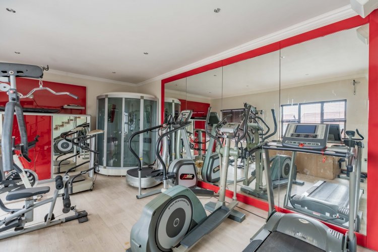 This extraordinary Beverly-Hills-styled three story, 5 bedroom, 4 bathroom luxury home boasts a magnificent, stately Greco-Roman façade and front entrance that opens into a double garage on one side, and a fully equipped gym on the other.