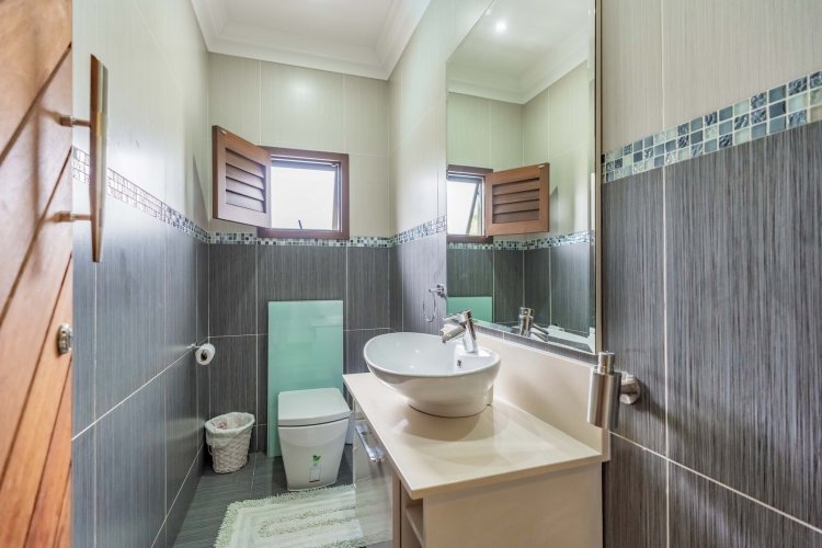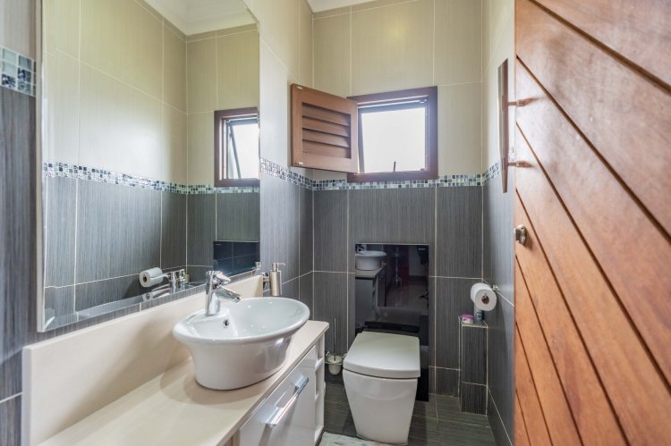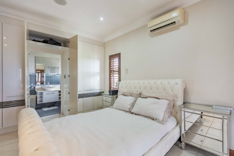 A beautiful waterfall of crystals’ chandelier catches the eye as the upstairs opens onto the luxurious, high gloss tiled open plan lounge, dining and kitchen areas complete with custom made Plantation Shutters and a sumptuous guest bedroom with en suite bathroom and private balcony.