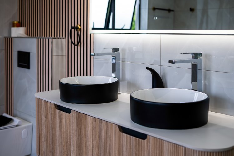 UPSTAIRS: Upstairs, the home continues to impress with a spacious pajama lounge and a built-in kitchenette featuring a basin and space for a bar fridge, creating an ideal family living hub. Four generously sized family bedrooms are located on this level, each with its own en-suite bathroom and access to a balcony. The main suite is a sanctuary of luxury, filled with natural light from large windows and opening onto a private balcony. It features a walk-in dressing room with a built-in vanity and a beautifully finished en-suite bathroom, offering a private retreat of serenity and comfort.