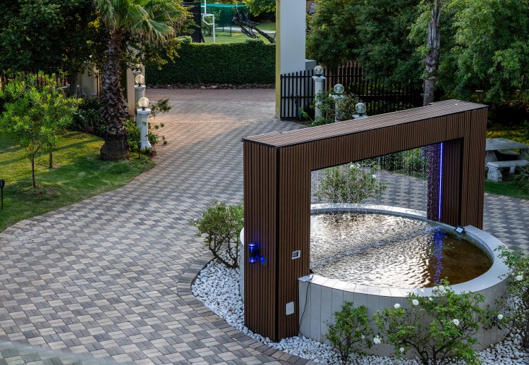 ENTRANCE: As you drive onto the property, you are welcomed by a magnificent entrance framed by a striking bulkhead and a beautiful water feature that immediately sets the tone for what lies beyond. A stunning central fountain becomes the focal point of the driveway, allowing you to drive gracefully around it in a circular flow that leads seamlessly to the garages. This elegant arrival experience is reminiscent of a private luxury estate, offering both convenience and visual impact while creating a true sense of grandeur from the very first moment.