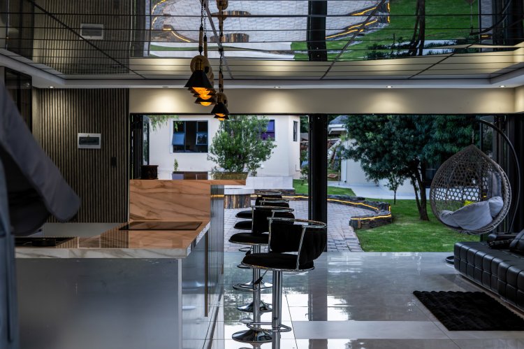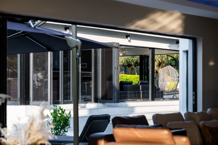 OUTSIDE ENTERTAINMENT: The outdoor areas rival those of a private luxury resort. Set on a generous 4,416 m² stand, the property features manicured gardens with full irrigation, a spectacular swimming pool with a fountain, and a jacuzzi, all beautifully finished with elegant decking. This outdoor oasis is complemented by a fully equipped pool house that includes a built-in bar with an electric hob, basin, wine rack, space for bar fridges, a wood braai, a sauna room, a private bathroom, and space for a television. Stacking doors open the pool house entirely to the outdoors, creating the ultimate indoor-outdoor entertainment space. Just beyond, a cozy boma area provides the perfect setting for evenings around the fire under the stars.