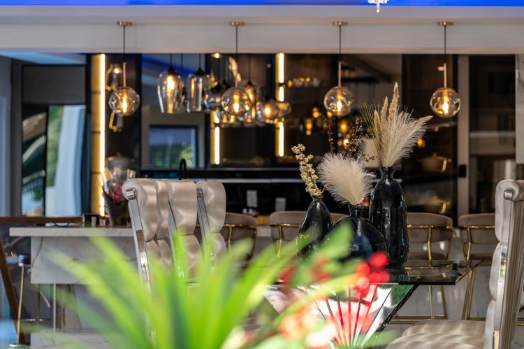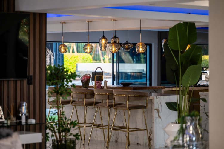 LIVING SPACES: As you enter the home, you are greeted by a grand entrance hall with a sweeping staircase illuminated by soft lighting and crowned with a striking chandelier. The main living areas unfold into multiple open-plan lounges and dining spaces, each thoughtfully positioned to create flow while still allowing for private moments. There is ample space for multiple entertainment setups, including two TV areas, making this home ideal for large families or hosting guests. A guest toilet is conveniently located, while a private gym with doors opening to the garden offers a peaceful space for wellness and relaxation. Hidden storage beneath the staircase ensures functionality without compromising the clean aesthetic of the home. A wooden fireplace positioned near the dining area adds warmth and atmosphere, while a beautifully designed wine cellar tucked under the staircase completes this level. A secondary staircase next to the kitchen offers easy and private access to the bedroom wing.
