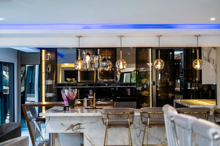KITCHEN: The kitchen is a masterpiece in its own right, designed for both daily living and high-end entertaining. A large centre island with a breakfast nook and prep bowl anchors the space, while the combination of a five-plate gas hob, two-plate electric hob, double ovens, built-in microwave, and integrated coffee machine caters to the most discerning home chef. Pop-up plugs keep countertops sleek and uncluttered. The separate scullery is equally impressive, featuring a built-in cooler room ideal for a private chef or large events, double basins, space for a double fridge, three front-loading appliances, and an additional electric hob with extractor fan.