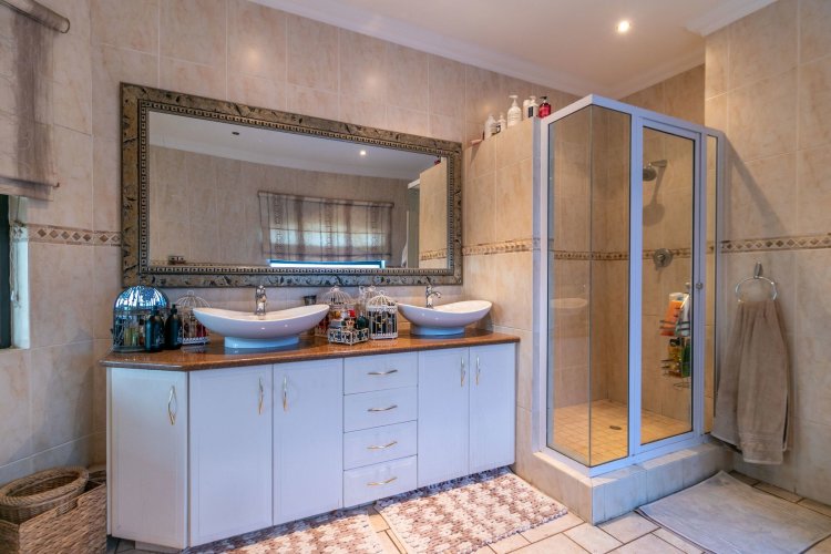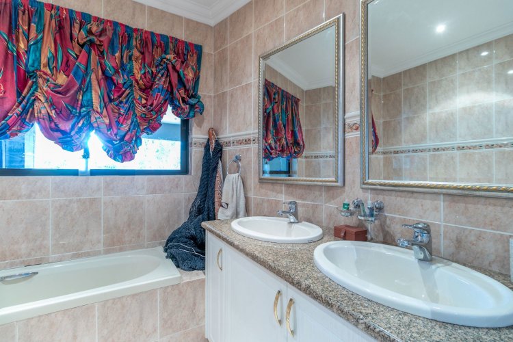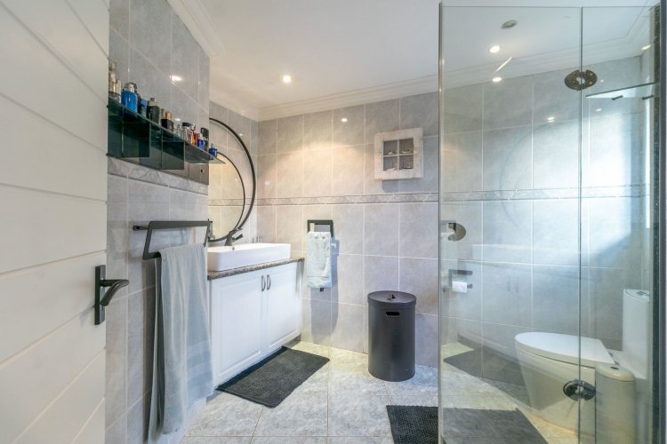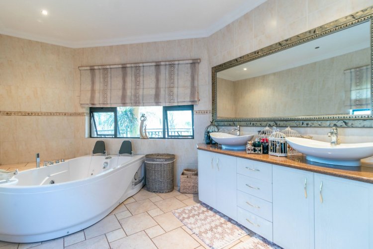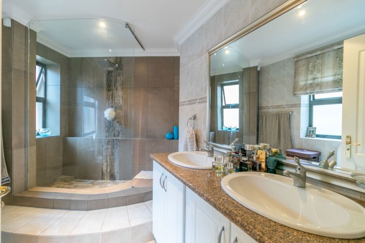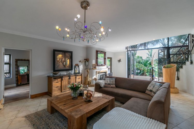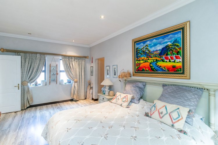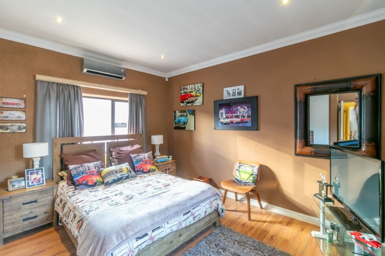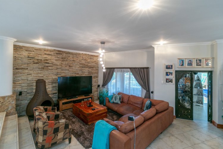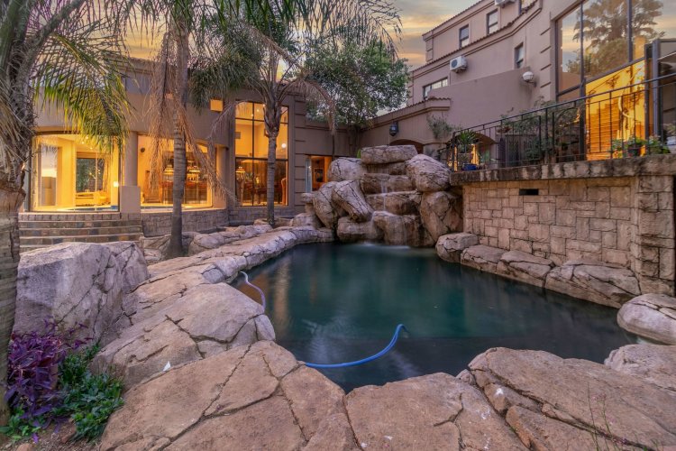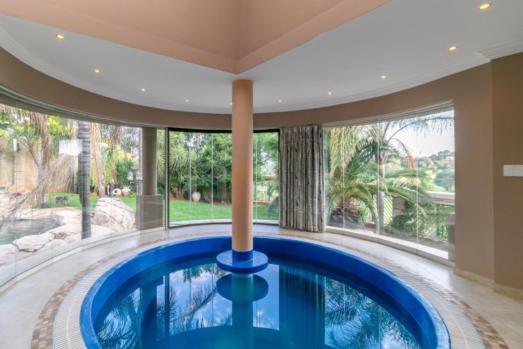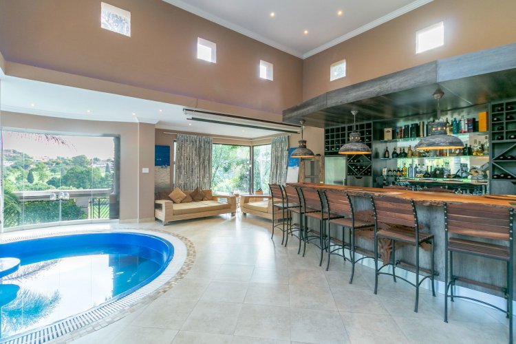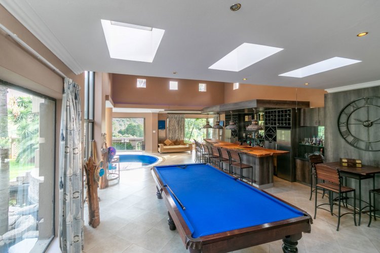 Adjacent to the dining room is the entertainment room, boasting its own lounge, skylights, an impressive bar, and an indoor heated swimming pool. Notably, the glass windows are actually frameless stackable doors, seamlessly opening up the space and connecting the indoors with the outside. An additional heated rock pool outside provides enjoyment on hot summer days. This house has been cleverly designed for the entertainer, yet it offers much more. The undercover patio allows for the pleasure of braais even on rainy days.