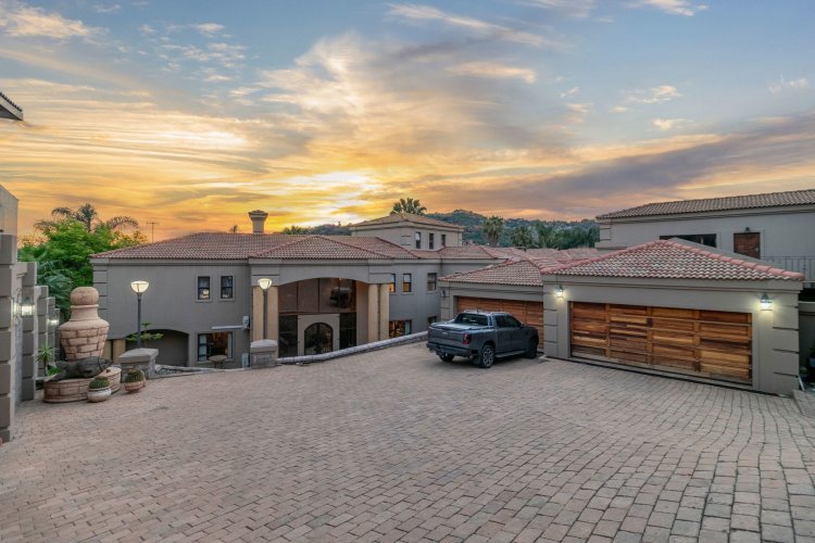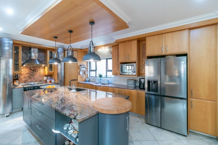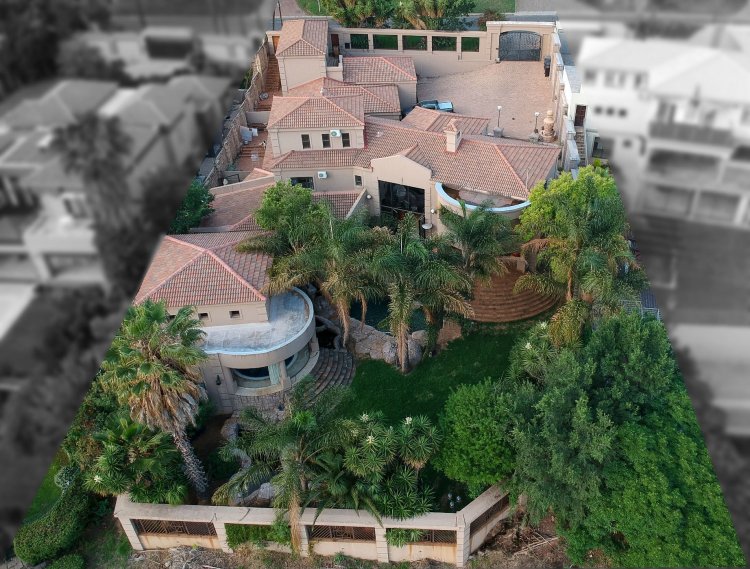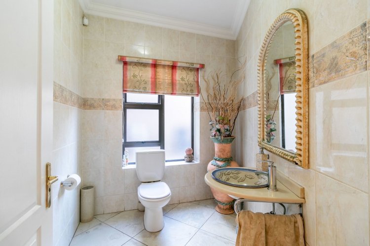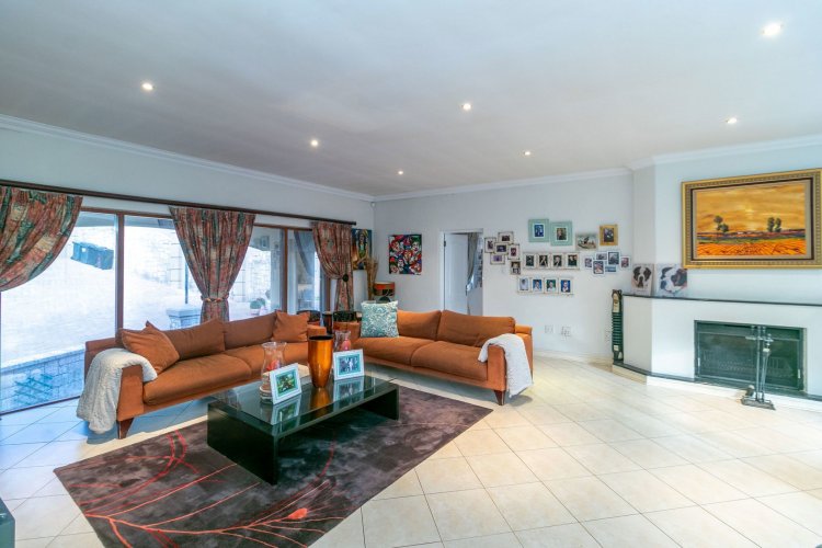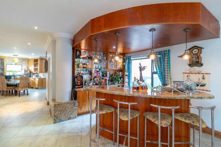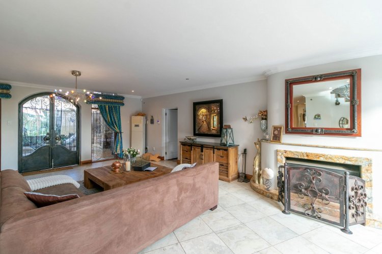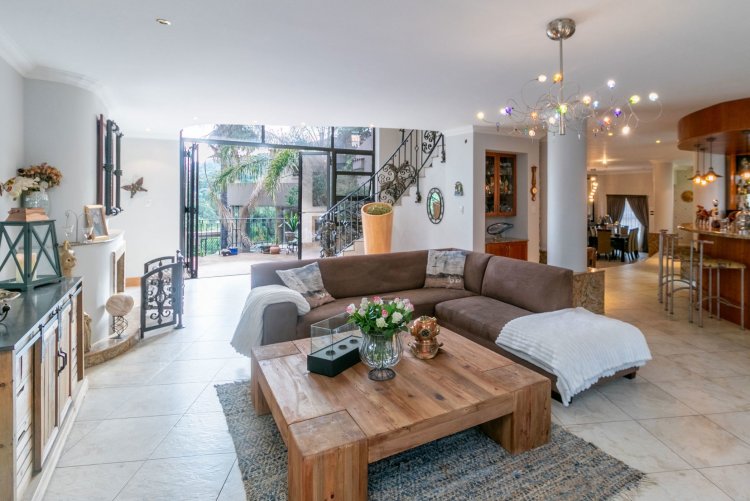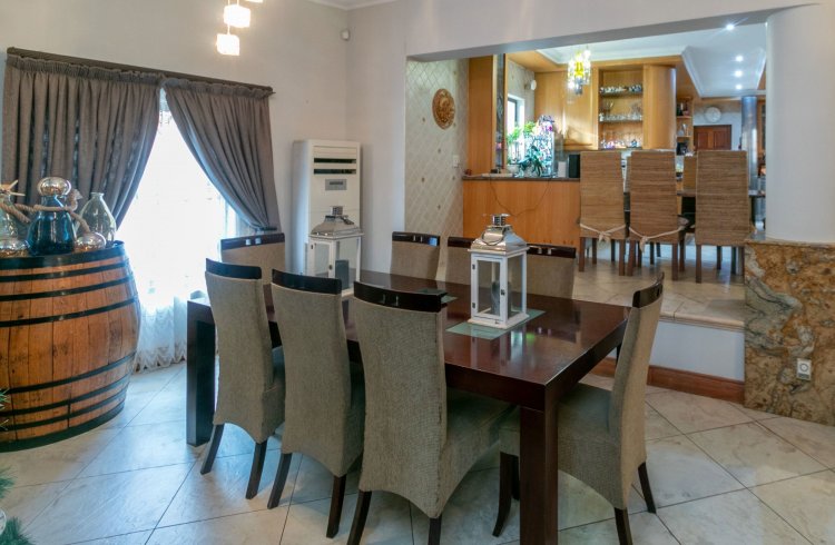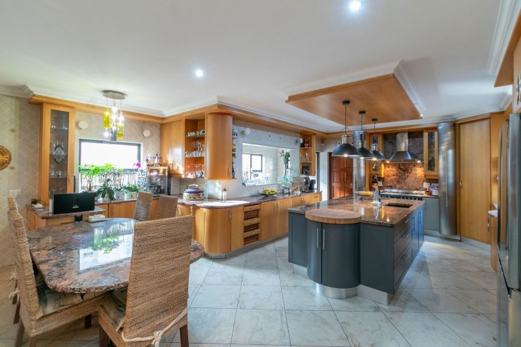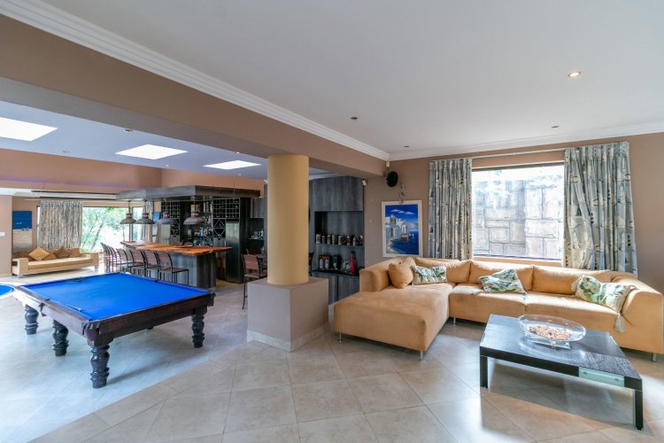 Upon entering this magnificent residence through the impressive steel double doors, you encounter a remarkably spacious open-plan layout. Directly in front of you is the formal lounge featuring a fireplace. To the left, there's the 6th bedroom or guest room, currently utilized as an office. On the right, the open-plan area extends, encompassing a guest toilet. A bar is strategically positioned to cater to the formal lounge, family lounge, dining room, and kitchen. The kitchen itself boasts a 5-seater breakfast nook, a central island, a pantry, a gas stove with an electric oven, and a separate scullery.