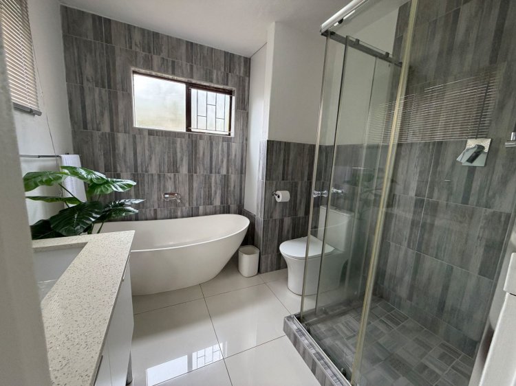 The open plan kitchen is immaculately finished with Caesarstone countertops, an under-counter oven, hob, and good cupboard space. The lounge leads out to a covered veranda and level garden, creating a pleasant indoor-outdoor flow.