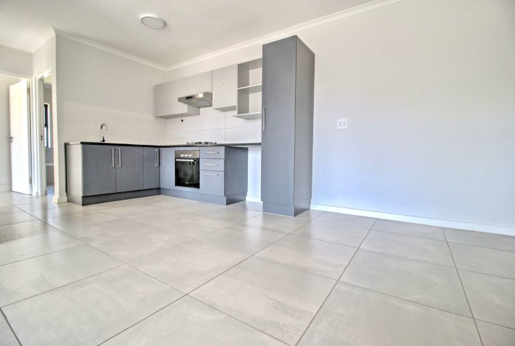 The kitchen is clean and contemporary, well positioned within the living area for convenience and connection.