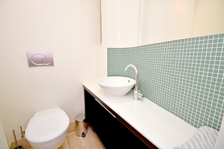 Privately situated with only two apartments per floor, the home opens through a grand pivot door into a generous entrance hall with a guest cloakroom. The open-plan living and dining areas are filled with natural light from large windows, creating an airy and welcoming atmosphere throughout, leading out to a covered patio.