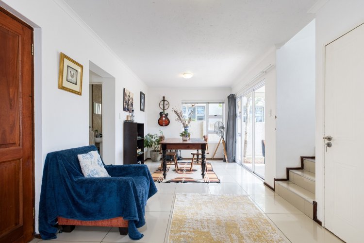 The entrance opens into a bright, open-plan lounge and dining area, perfect for relaxed living and entertaining. A quaint kitchen overlooks the generous living space, creating a seamless flow throughout the ground floor. A covered patio leads out from the dining area into a charming, low-maintenance garden — ideal for weekend braais or morning coffee outdoors. A guest toilet completes the downstairs layout.