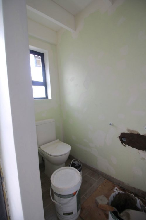 The home offers one bedroom with built-in cupboards and a private en-suite bathroom fitted with a shower, basin, and toilet. A second guest bathroom is conveniently located near the living area for visitors' use.