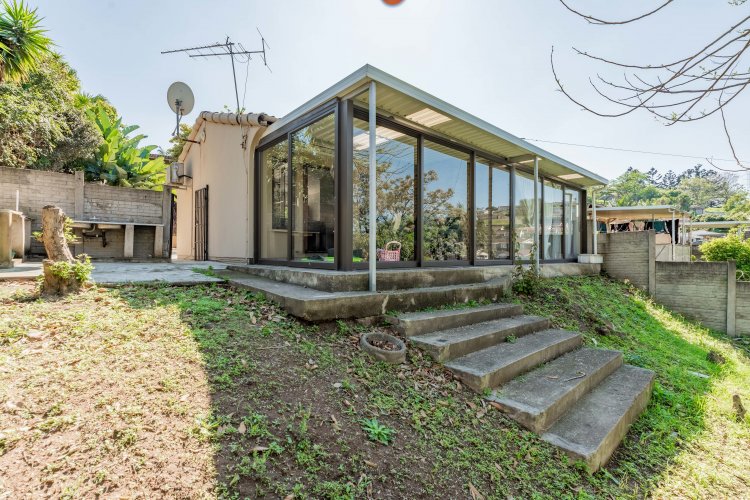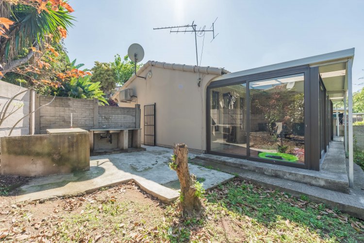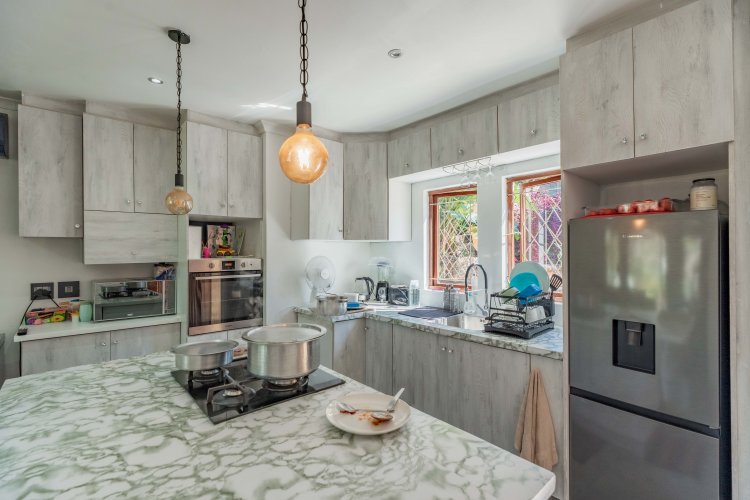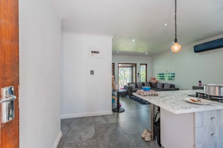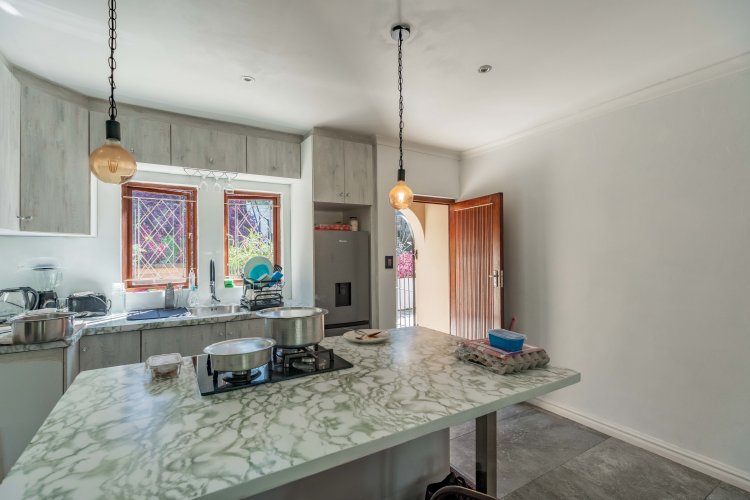 Step inside to discover a fully tiled, open-plan lounge and kitchen, designed for modern living. The lounge area is fitted with an air conditioner to ensure your comfort all year round. The kitchen is a culinary enthusiast's dream, featuring granite and concrete countertops, a center island with a gas stove, and a fully fitted layout with ample cupboard space. The sliding aluminium doors lead to an enclosed sunroom, perfect for soaking in the morning rays over a cup of coffee. The entertainment area sliding doors bring light, brightness, and nature indoors, creating a tranquil, homely feeling with a seamless connection to the outdoors.