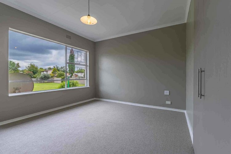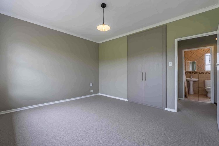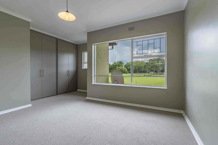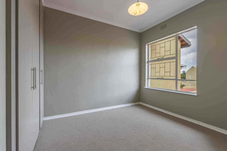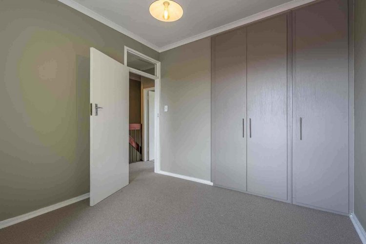 A striking wooden staircase leads upstairs to a spacious main bedroom with ample built-in cupboards and brand new carpets. The large window in the main bedroom allows for ample natural light to enter the room and boasts with the most beautiful views of the green park and gardens. The bright second bedroom is generously sized, with built-in cupboards, brand new carpets and large window. The full bathroom upstairs has a bath and shower for your convenience.