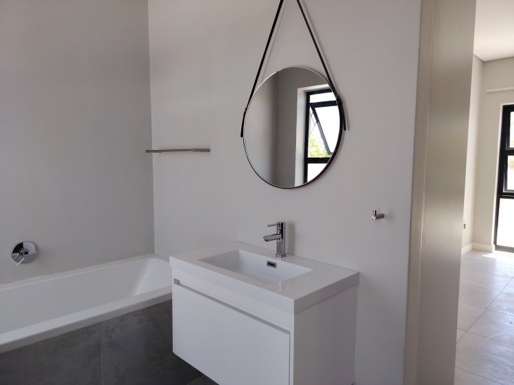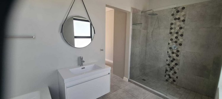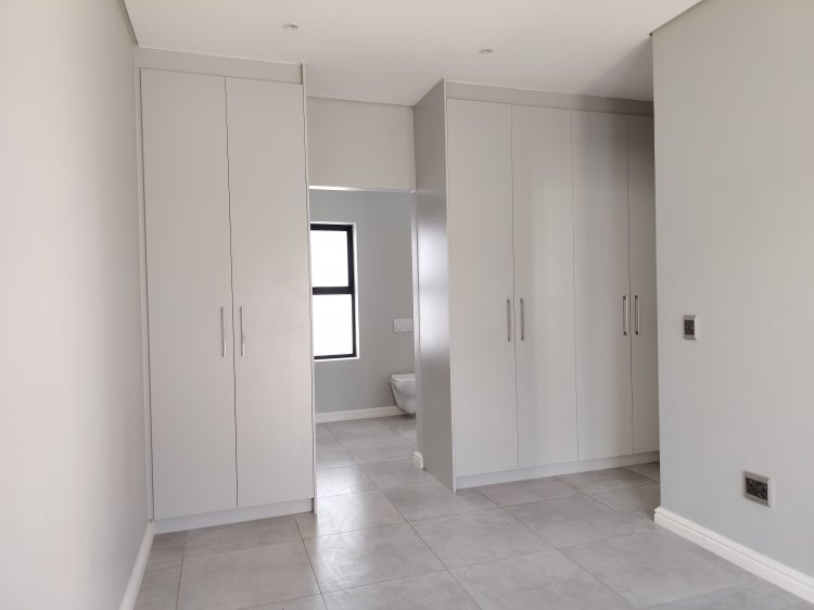 This elegant three-bedroom home is set within the highly desirable Croydon Gardens Estate, offering contemporary estate living in the heart of the Winelands. Designed with modern architectural appeal and quality finishes throughout, the home features a light-filled open-plan layout where the lounge and kitchen connect seamlessly, enhanced by tiled floors, recessed lighting, and a stylish glass balustrade staircase. The sleek kitchen boasts light-grey cabinetry, white quartz countertops, a practical centre island, and integrated appliances including a hob, oven, and extractor fan. Upstairs, three generously sized bedrooms provide comfortable accommodation, with the main bedroom enjoying a private en-suite bathroom, while the remaining bedrooms share a modern family bathroom; a guest toilet on the ground floor adds everyday convenience.