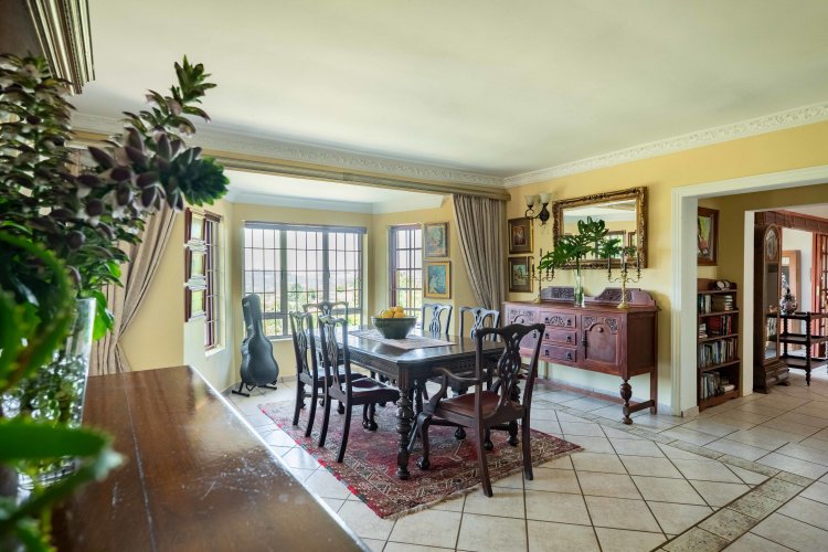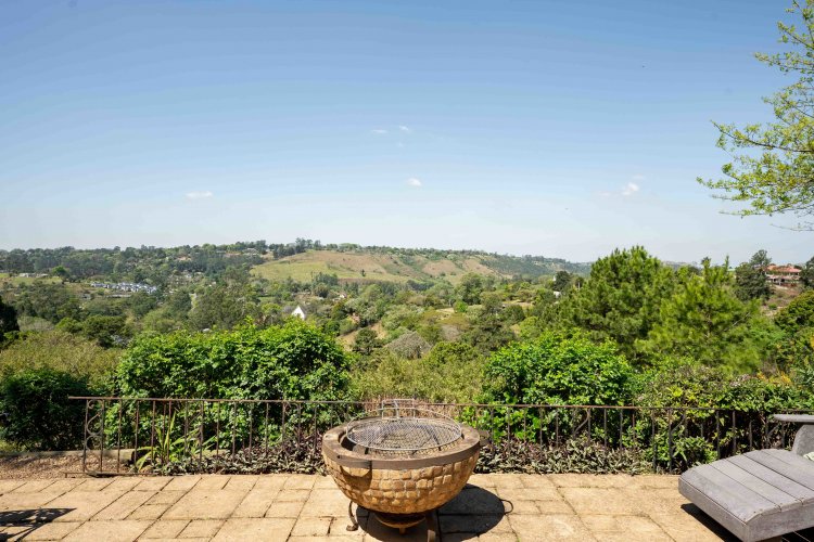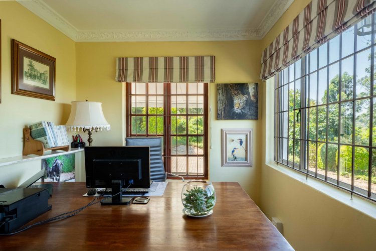 The entrance hall leads to a separate study and dining room, both enjoying the sweeping outlook. The kitchen, with gas hob, under counter oven, prep bowl, and double sinks, is also plumbed for a dishwasher and opens onto a sheltered courtyard that doubles as the laundry and utility area.