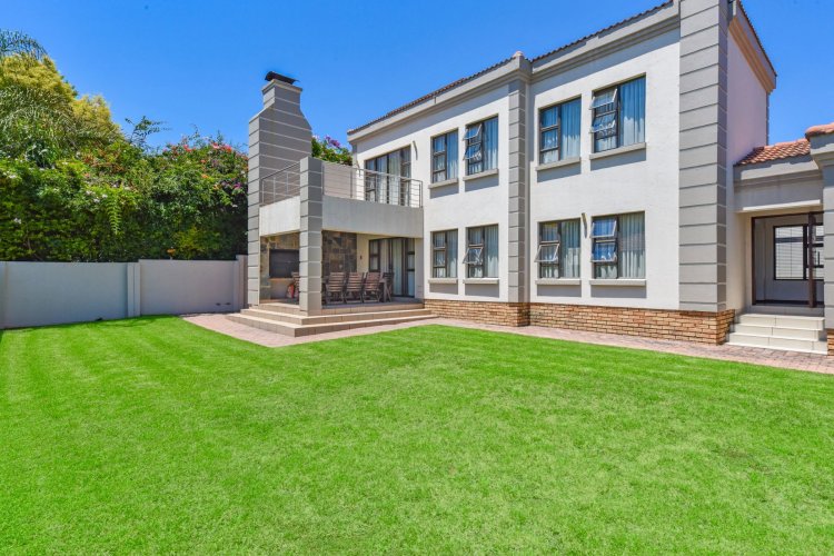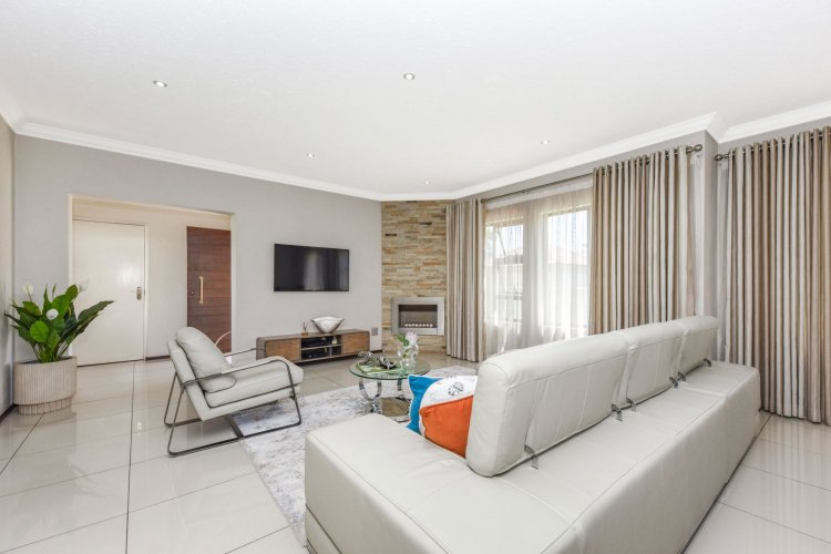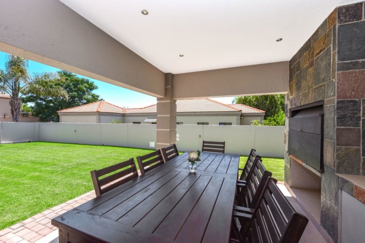 If you are looking for rare comfort and luxury, then this is your home. A welcoming entrance leads you to an open plan lounge and dining room with a gas fire place and porcelain tiles. The second T.V lounge leads out to an expansive irrigated wrap around garden and covered entertainers patio with a built in braai.