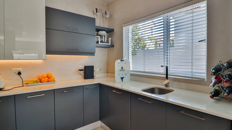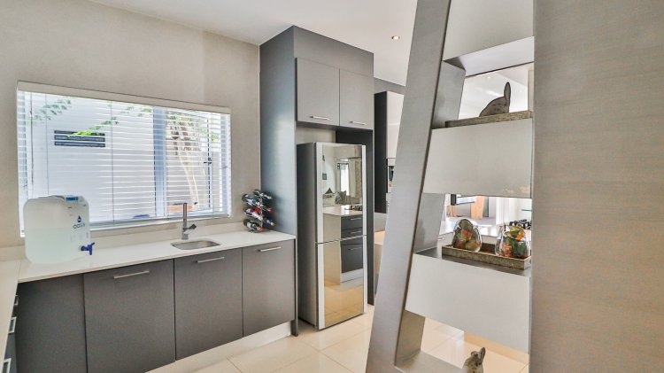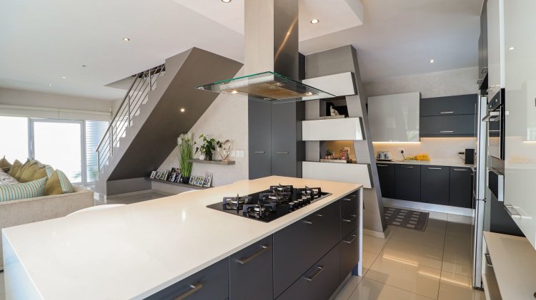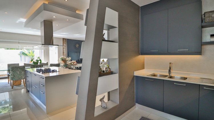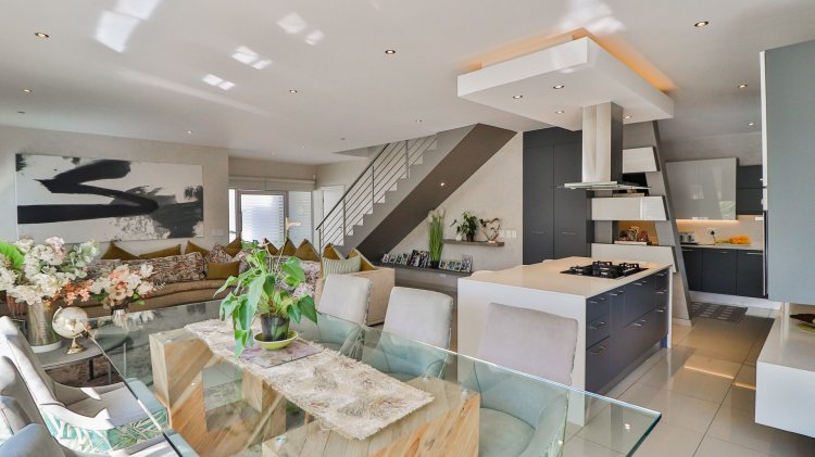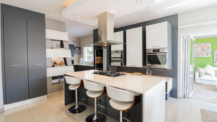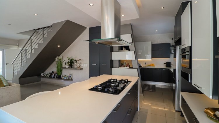 The kitchen is a real showpiece. Glossy cabinetry in contrasting tones, a central island with a gas cooktop, stainless steel range hood, and integrated appliances make cooking both practical and enjoyable. Decorative shelving and thoughtful lighting add character, and the adjoining dining area flows seamlessly into the lounge.