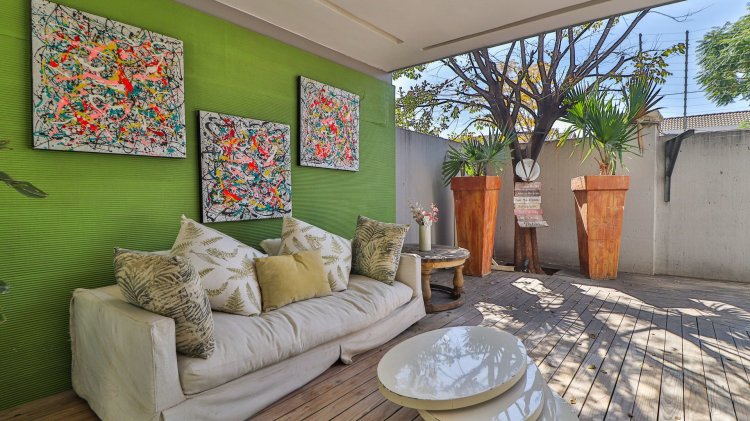 Outdoor living is just as inviting: a patio framed by lush greenery, colorful art on accent walls, and a pool that feels like a private retreat.