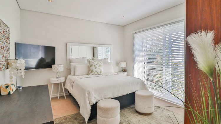 A stainless steel and glass staircase leads upstairs to a versatile pajama lounge — perfect for working from home or winding down with a book. The bedrooms are bright and serene, with mirrored accents, contemporary art, and a luxurious main suite complete with an en‑suite bathroom.