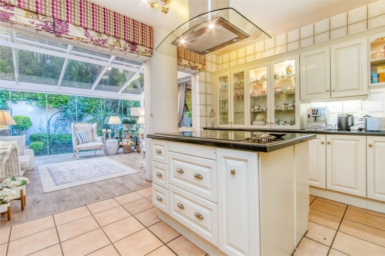Enhancing the home’s lifestyle appeal, the kitchen features a sun-filled conservatory that opens onto a private putting green—ideal for relaxed living and refined entertaining. Completing the lower level, there is a guest cloakroom, and the study with a gas-warming fireplace off the private lounge can easily be changed up to make a fourth bedroom.