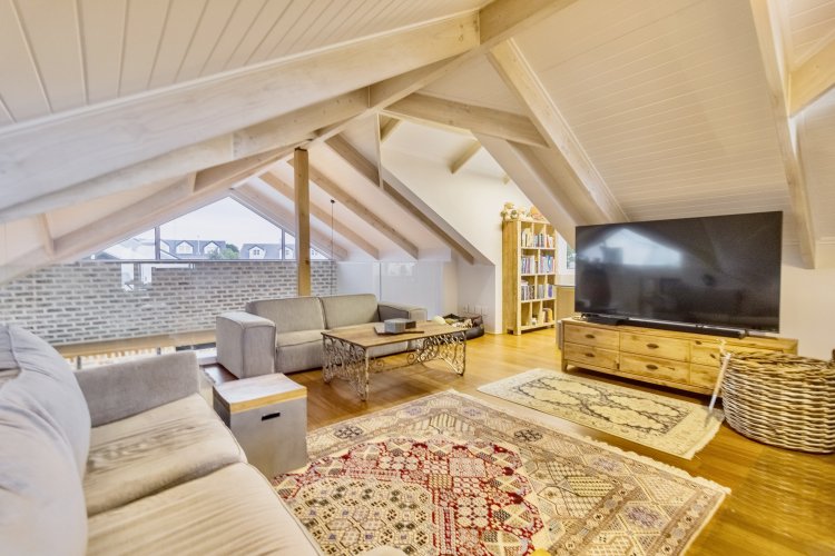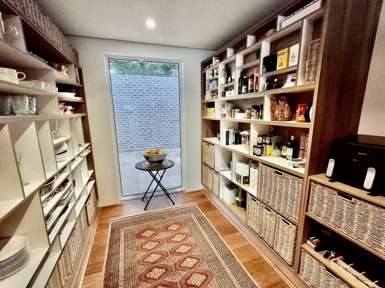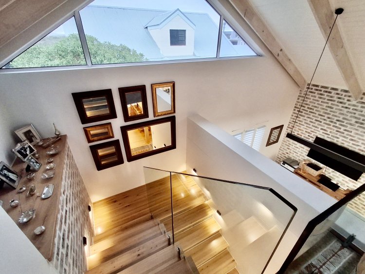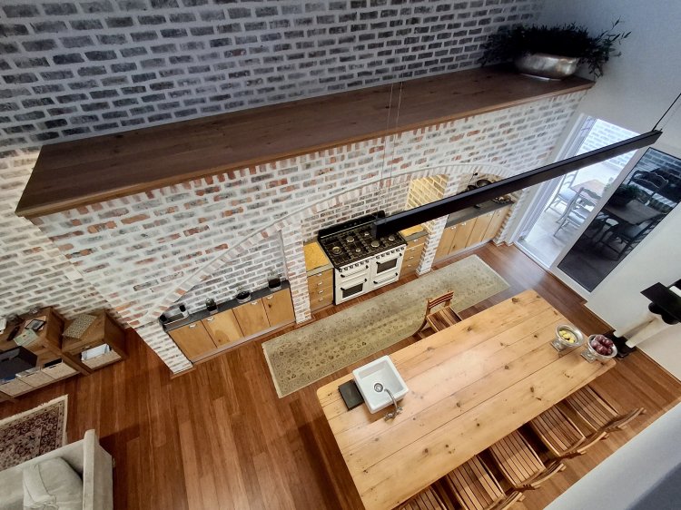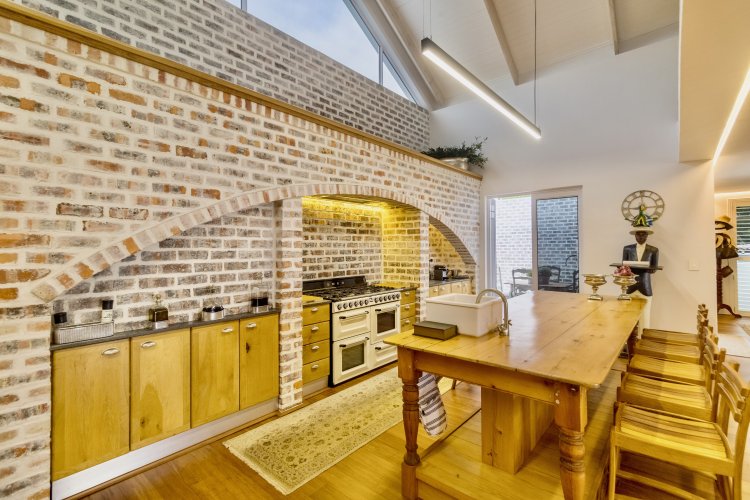 Raw stained brick, solid oak, brushed nickel steel and expansive floor-to-ceiling glass create a warm contemporary aesthetic. Bamboo flooring flows throughout, complemented by ambient shadow lighting. A striking water feature welcomes you into a double-volume living space crowned by exposed trusses and centred around a dramatic designer kitchen.
