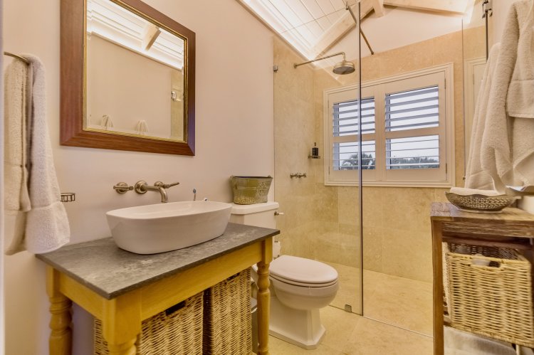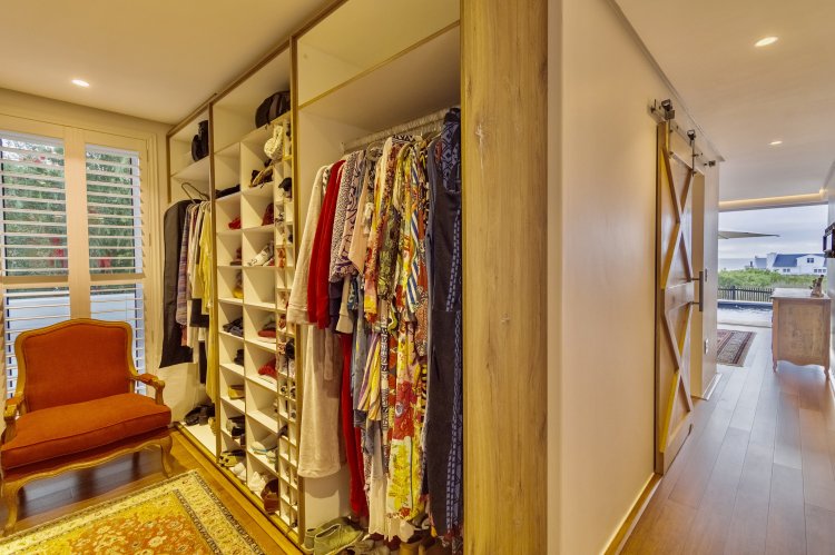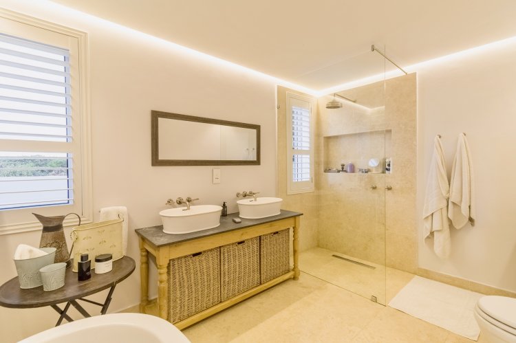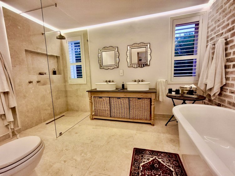 Ground Floor: Two luxurious master wings, each with walk-in dressing room and full Travertine en-suite bathrooms with double vanities. Both open directly onto the pool via cavity sliders and Japanese teak stable doors. American shutters throughout.