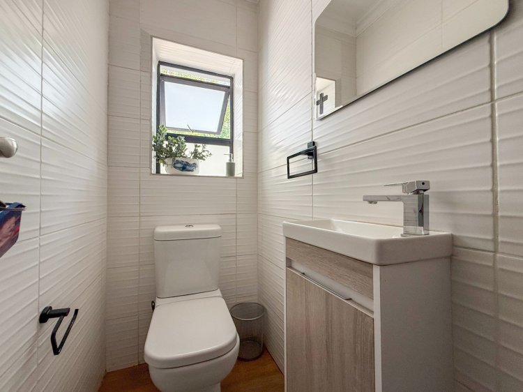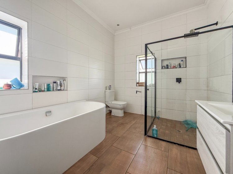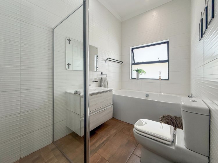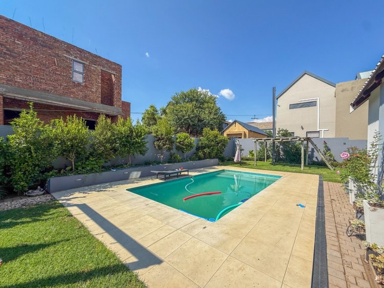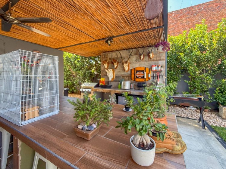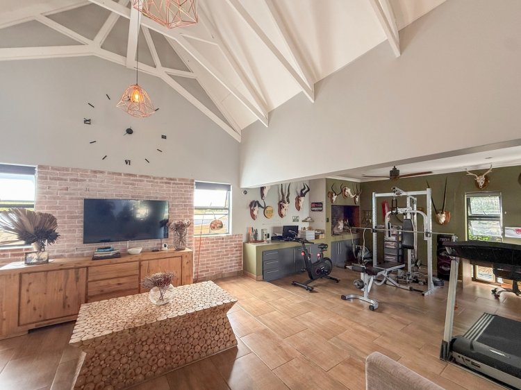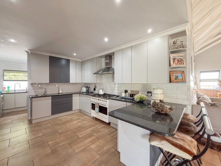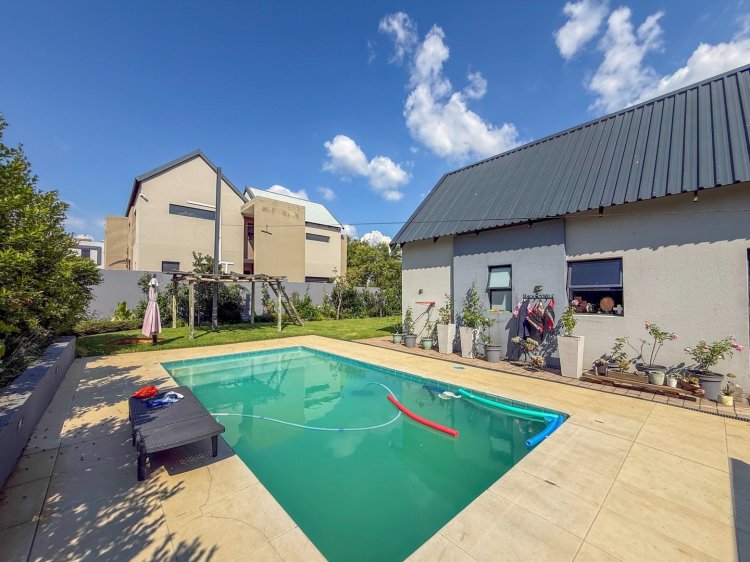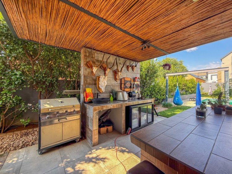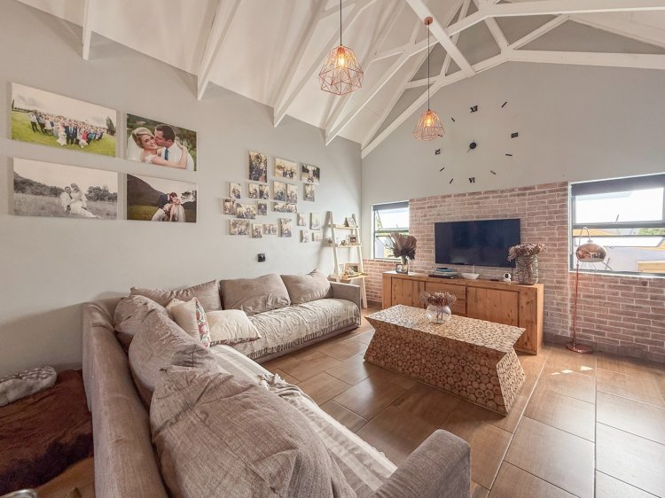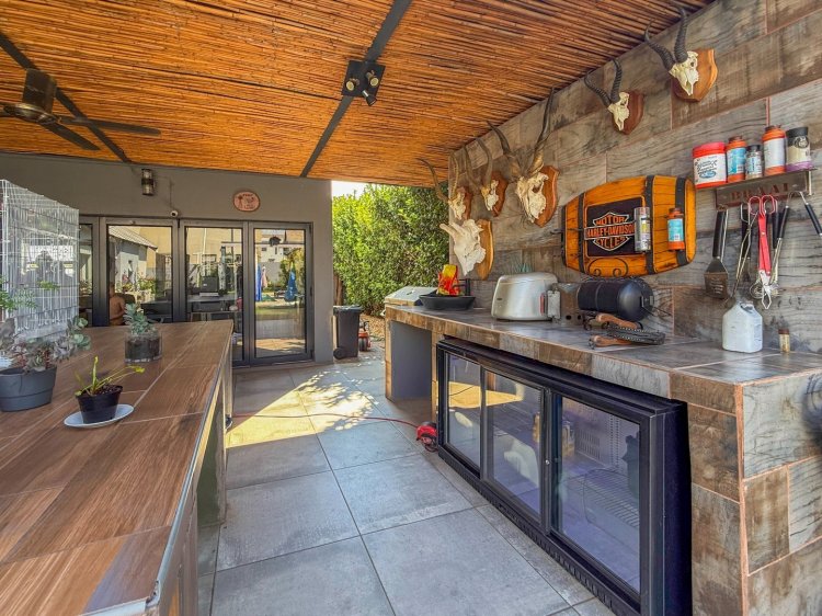 Characterful face-brick accents and vaulted ceilings add warmth and texture to the living areas, enhancing the home’s modern-rustic appeal. Large stack doors extend the living space onto a covered braai patio complete with built-in counters and a sink, ideal for year-round entertaining. The swimming pool, fitted with a solar heating system, ensures enjoyment in every season.