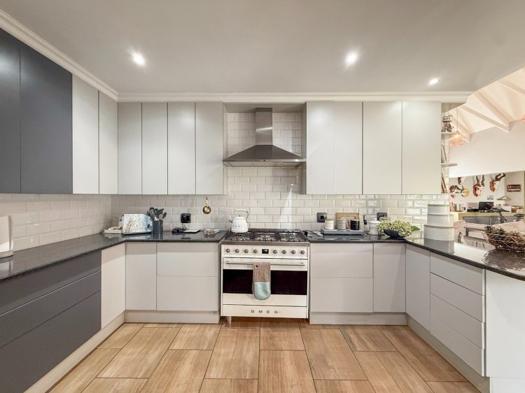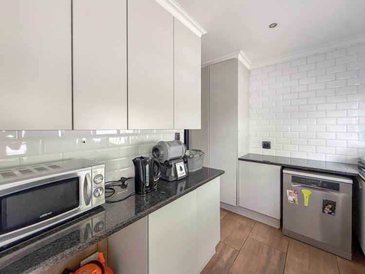 A welcoming entrance hall leads into a spacious open-plan living and dining area, while a separate passage provides privacy for the bedroom wing. The contemporary kitchen is finished to a high standard and includes a breakfast counter, gas hob, and a well-appointed scullery with generous space for laundry appliances.