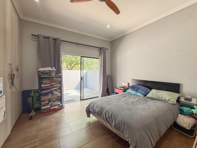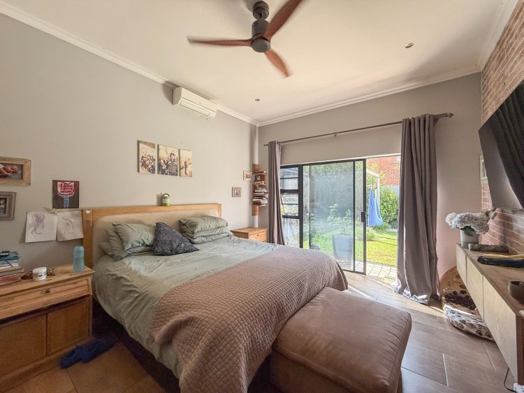 The main bedroom offers a private retreat with a walk-in dressing area and a full en-suite bathroom. Two additional bedrooms are generously sized, feature built-in cupboards, and share a full family bathroom. All bedrooms open directly to the outdoors via sliding doors, reinforcing the home’s seamless indoor-outdoor flow.