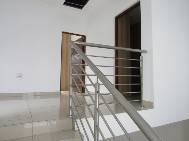 The feature staircase with stainless steel balustrades leads to an open area ideal for a home office or children's playroom, flowing effortlessly to three well-presented, sun-filled bedrooms.