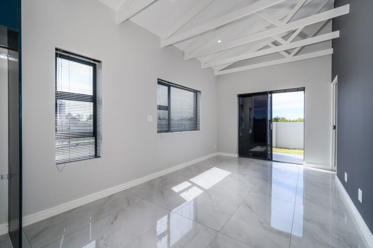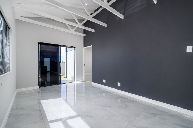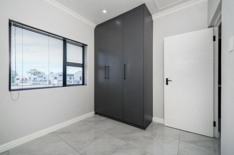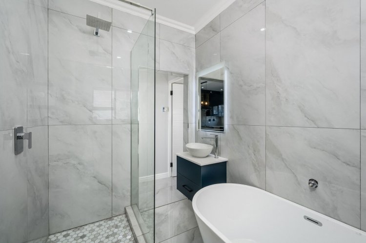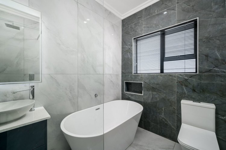 Three bedrooms featuring high-quality grey built-in cupboards. One complete bathroom. Standalone tub and walk-in shower. Basin on a vanity cabinet and an impressive LED mirror. Stunning porcelain tiles that stretch to the ceiling.