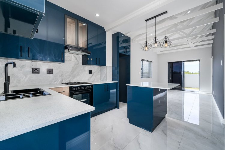 This contemporary home includes a designer kitchen featuring an oven, hob, and extractor fan. The countertops and center island are beautiful Eazi Quarts.