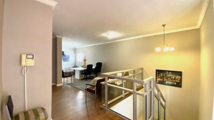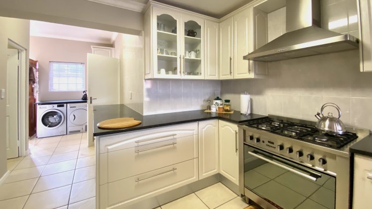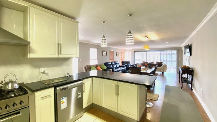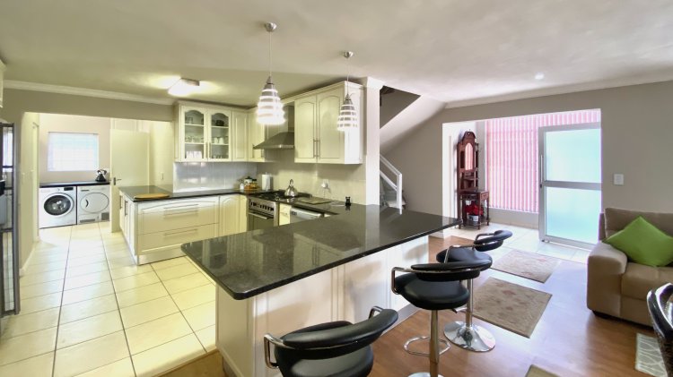Downstairs: An expansive open-plan lounge and designer kitchen (with separate scullery) that flows onto a semi-covered stoep with a built-in braai.