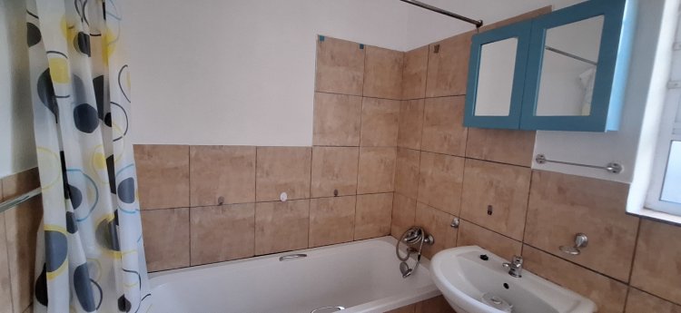 The fully tiled bathroom is clean and timeless, fitted with a bathtub, handheld shower, basin, and toilet — offering both comfort and practicality.