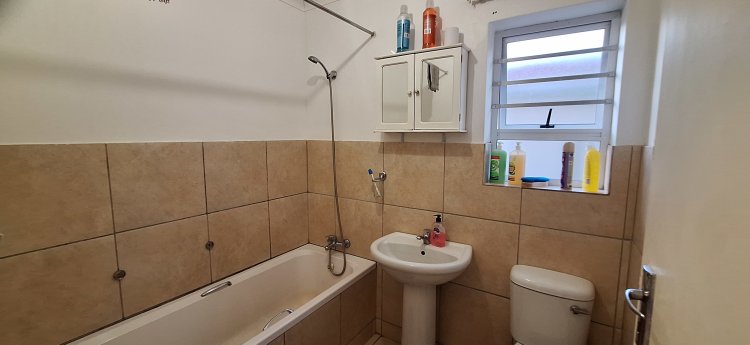 The fully tiled bathroom is sleek and functional, featuring a shower-bath combination, basin, and toilet — offering comfort and versatility for the whole family.