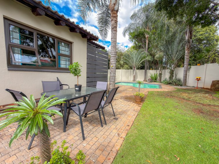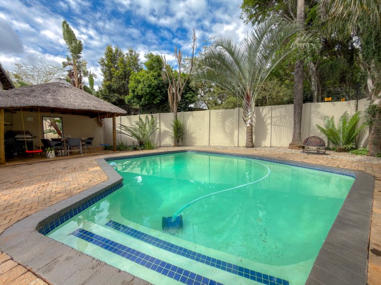 The outdoor areas are where this home truly shines. A sparkling swimming pool is set towards the back of the property, complemented by a spacious garden where children can play freely. A lapa adds versatility to the entertainment options, while automated irrigation keeps the garden looking its best throughout the year.