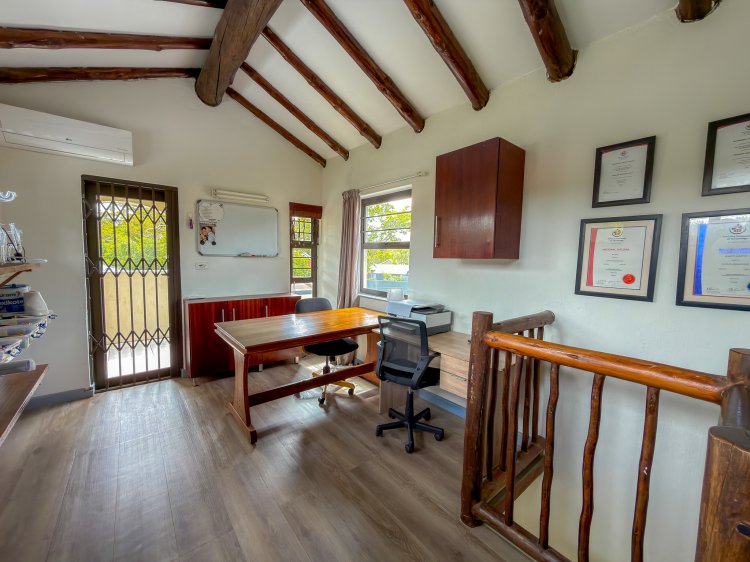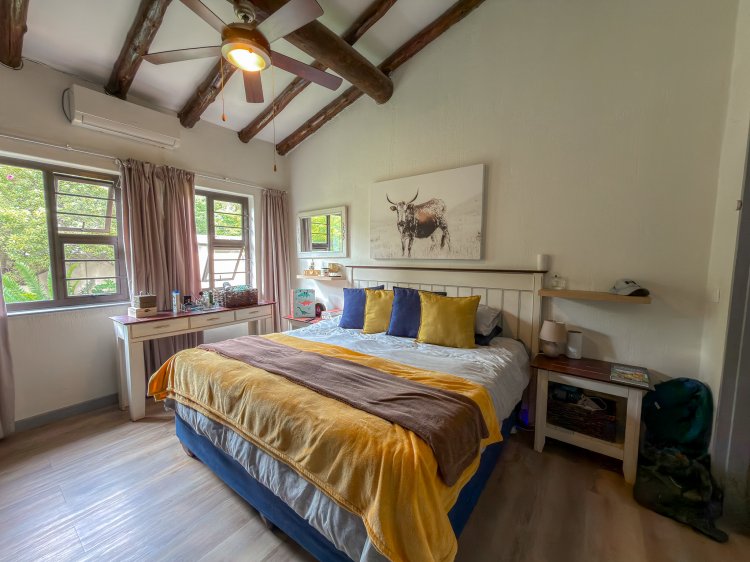 Accommodation comprises four well-sized bedrooms and two bathrooms. The main bedroom serves as a private retreat, complete with an en-suite bathroom featuring double vanities for added comfort. Laminated flooring throughout enhances the modern feel of the home, while exposed trusses add volume and character. Selected rooms are fitted with ceiling fans and air-conditioning to ensure year-round comfort.
