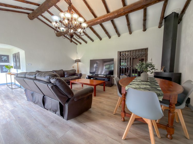 Designed with family life in mind, the home features expansive, light-filled living areas where the open-plan family and dining spaces connect beautifully. A fireplace anchors this central living zone, creating a warm and inviting atmosphere for both everyday moments and weekend entertaining. Sliding doors open onto a covered entertainment area with a built-in braai, an ideal extension of the home for long lunches, celebrations and laid-back afternoons.