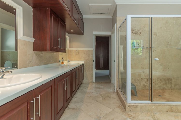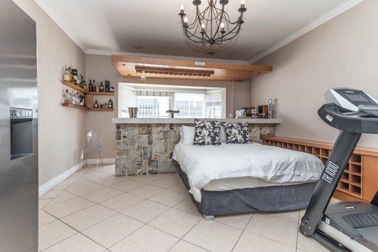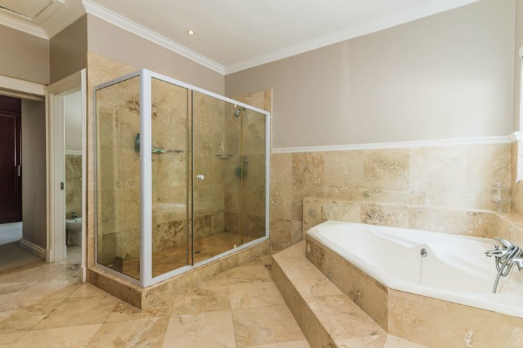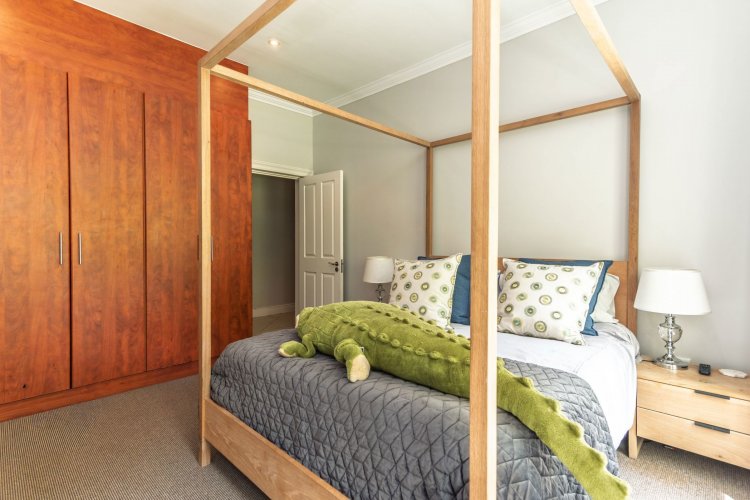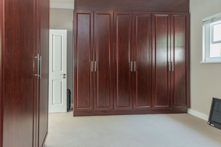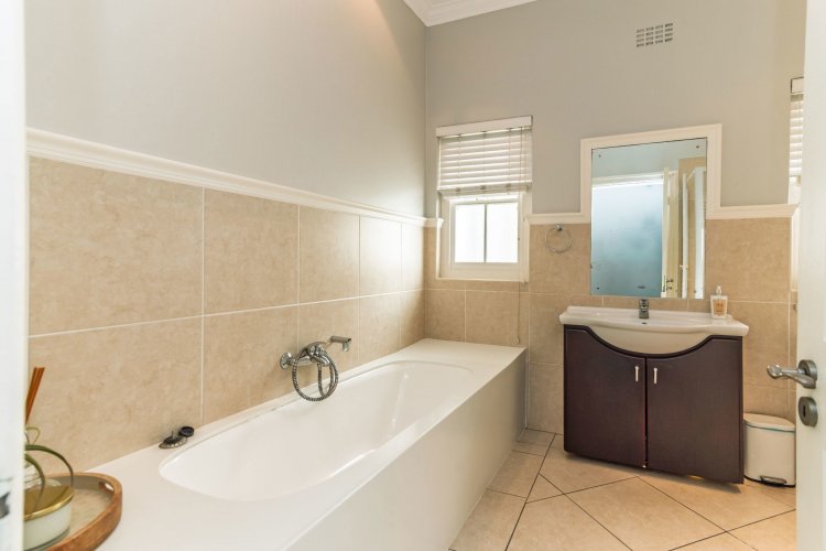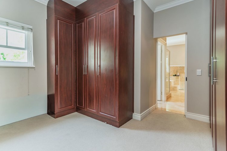 Accommodation comprises four bedrooms and three bathrooms. Downstairs, two bedrooms offer built-in cupboards. A full family bathroom services bedrooms one and two. A third downstairs en-suite bedroom is generously sized with French doors opening to the garden. The en-suite bathroom includes a shower, basin, and toilet. Upstairs, the spacious main bedroom suite with walk through dressing room, and sliding doors opening to a balcony with magnificent mountain views. The tiled en-suite bathroom is well-appointed with a corner bath, shower, double vanity and separate cloakroom with single vanity, bidet, and toilet.