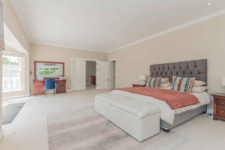 The garden and outbuildings enhance the appeal of the property, with automated entry gates and intercom access, including a second automated gate leading directly to the home. A paved forecourt leads to the automated double garage with direct access into the house, complemented by additional covered parking. The property offers a swimming pool, a reed-ceilinged undercover all-seasons veranda, and staff accommodation with a shower suite. The established, tree-filled garden welcomes ample bird life, while security features include a high front wall with electric fencing, external and internal security beams, and electric fencing along the front and driveway sides of the property.
