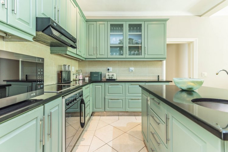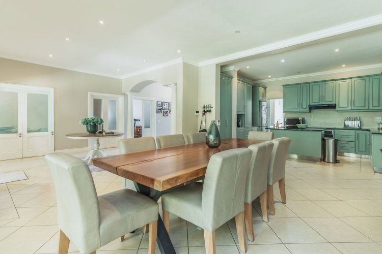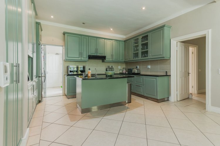 The open-plan kitchen adjoins the dining room and is designed for both functionality and sociability. It features a central island with breakfast counter and prep bowl, ample built-in cupboards with granite worktops. A separate scullery and laundry room offers additional built-in cupboards with granite tops, two stainless-steel basins, and plumbing for a washing machine and dishwasher. The kitchen provides access to a courtyard as well as direct entry into the double garage.