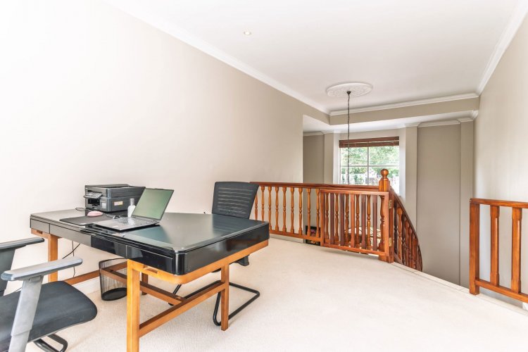 This spacious four-bedroom home is set within an established, leafy garden. One of only three properties in the estate, it is accessed via a paved driveway and automated wrought-iron gates. This north-facing, timeless classic offers generously proportioned rooms and presents a rare opportunity for a discerning buyer to add their own magic touch.