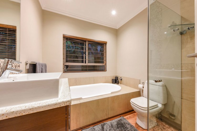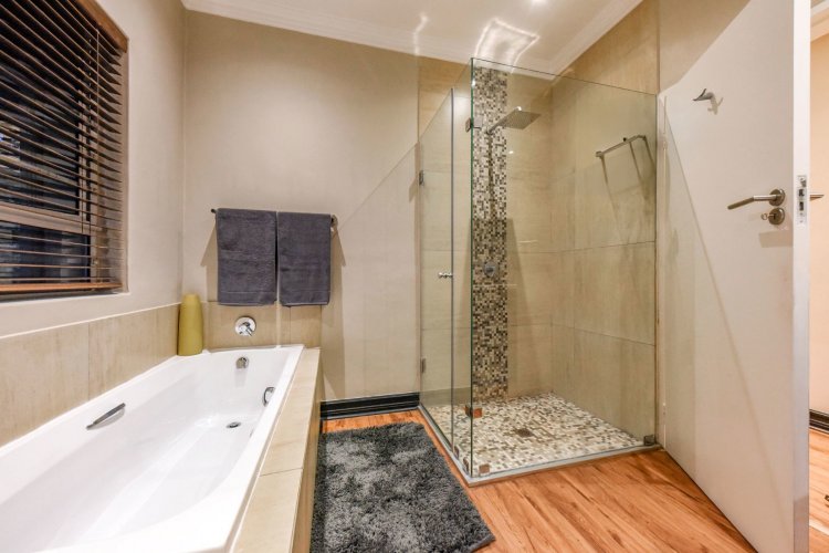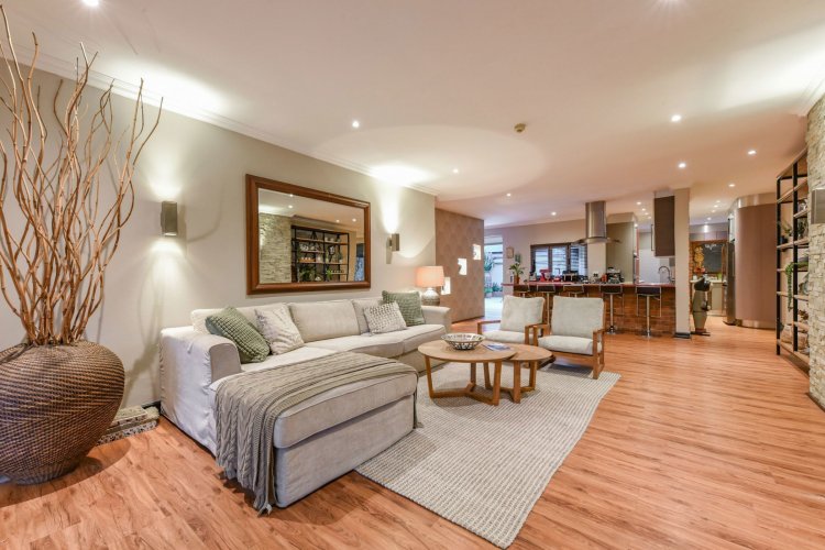 The accommodation includes four generously sized bedrooms, three full bathrooms, and a guest cloakroom. Central air conditioning serves the bedroom wing and study, while underfloor heating throughout the main house ensures year-round comfort. Elegant wooden laminate flooring flows through the living areas, with plush carpeting in the bedrooms adding warmth and sophistication.