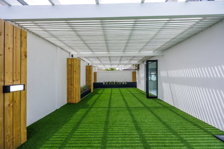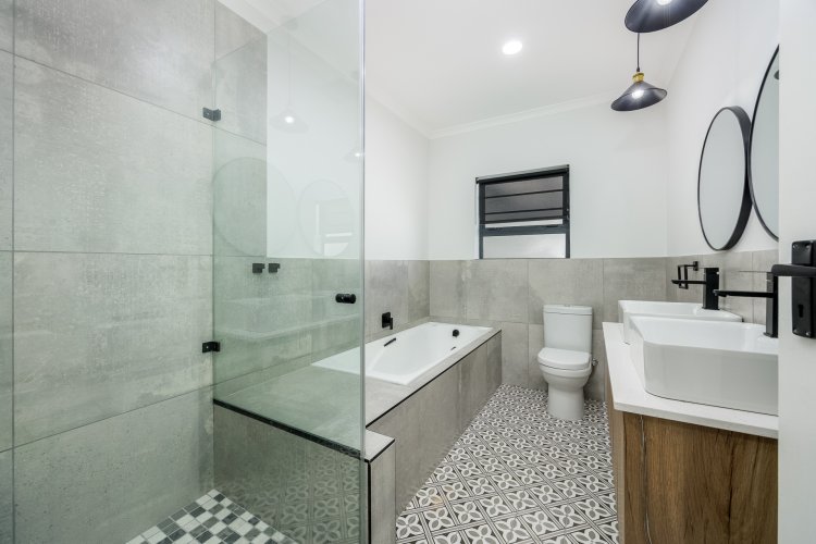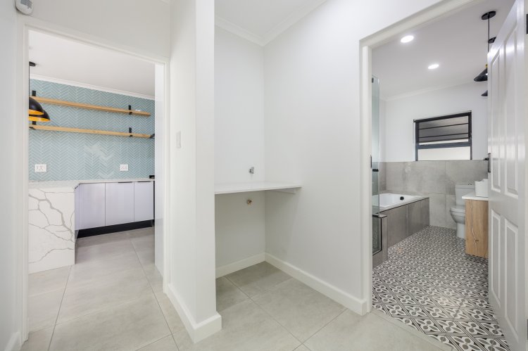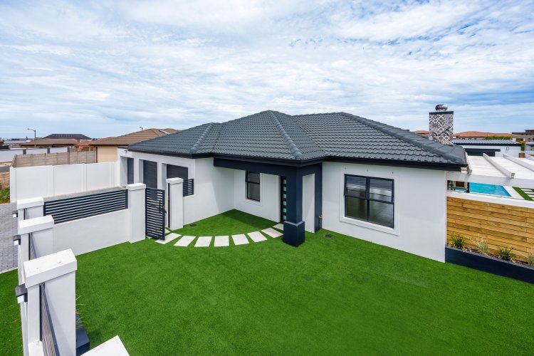 This exceptional modern home offers four spacious bedrooms, including a luxurious main suite featuring a full en-suite bathroom fitted with a bath, toilet, shower and double basins, ample built-in cupboards, air-conditioning and sliding doors opening directly onto the pool area.