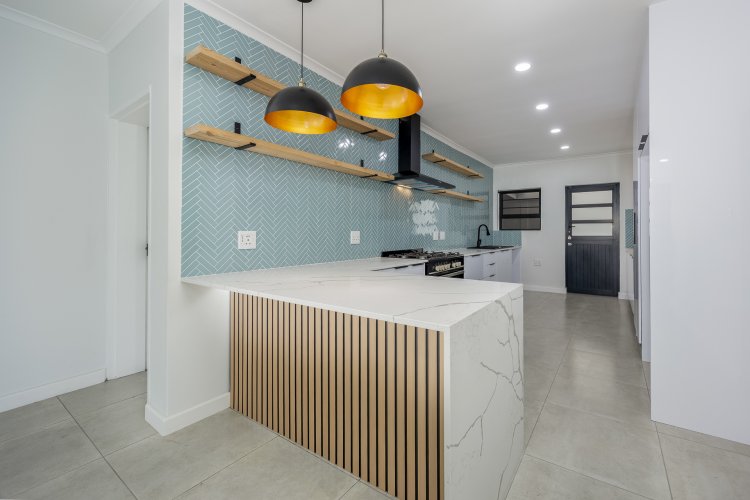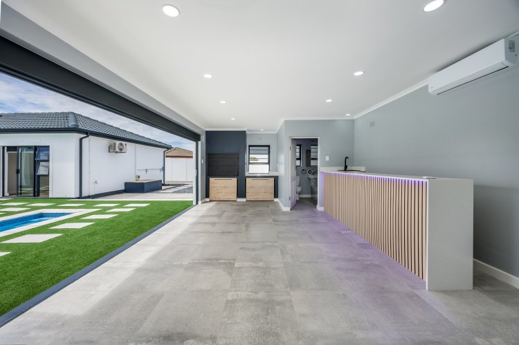 The fully fitted kitchen flows seamlessly into the open-plan dining area, lounge and braai room, where stacker doors open onto a beautifully landscaped yard and sparkling swimming pool, creating the perfect indoor-outdoor living experience.