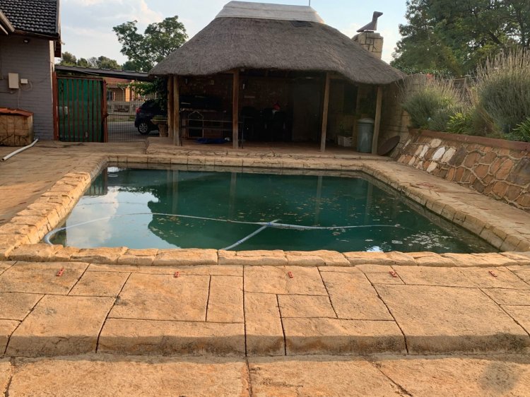 The house has the following: - 4 Bedrooms - Linen cupboard - Bathroom with tub and hand basin - Separate toilet - Pool and a thatch roofed lapa and a built-in braai area - Flatlet with bedroom, living area, bathrooms and a solar geyser - Double garage and carport for up to 6 cars - Storage - Big and neat garden