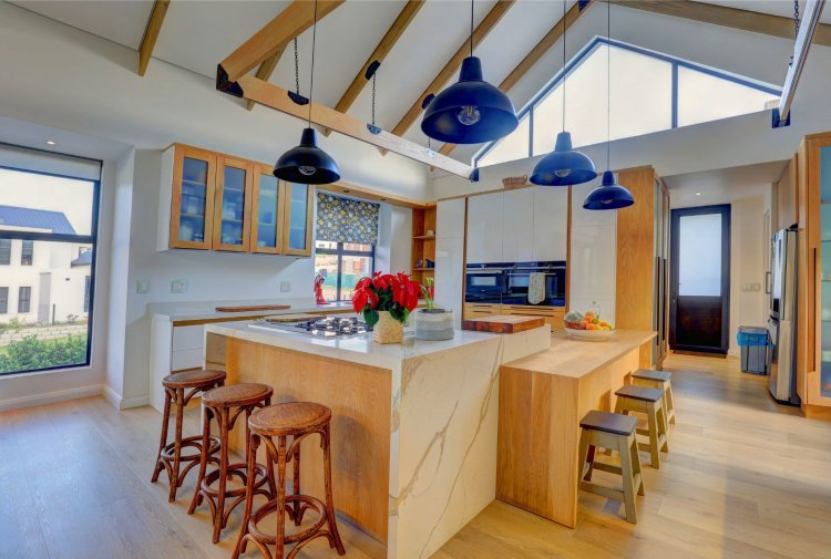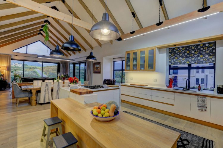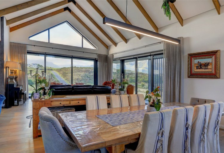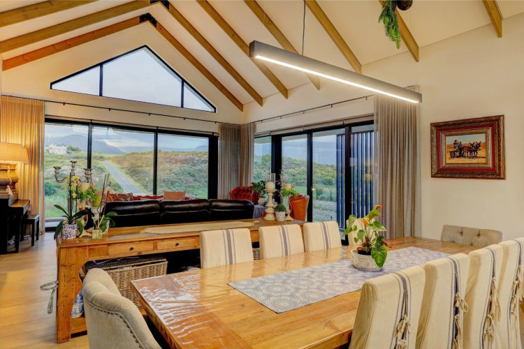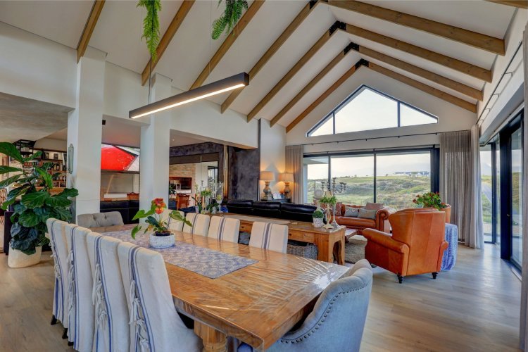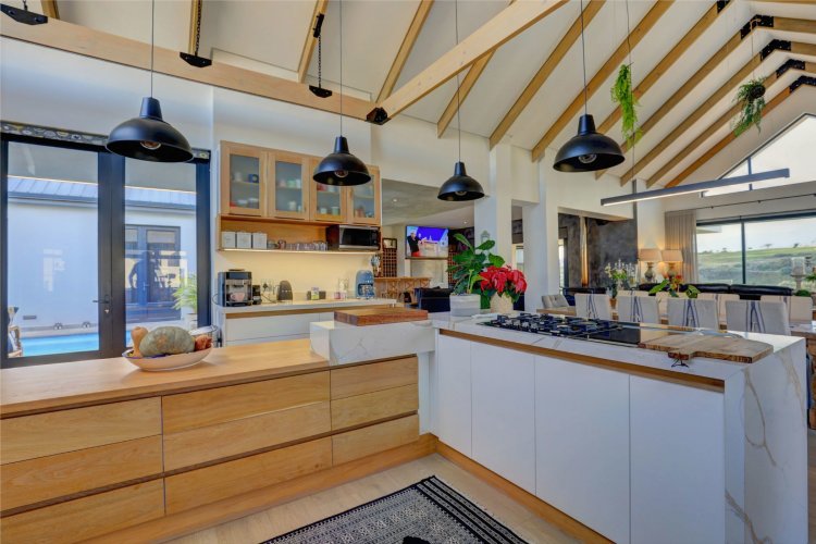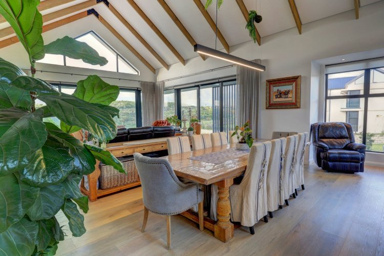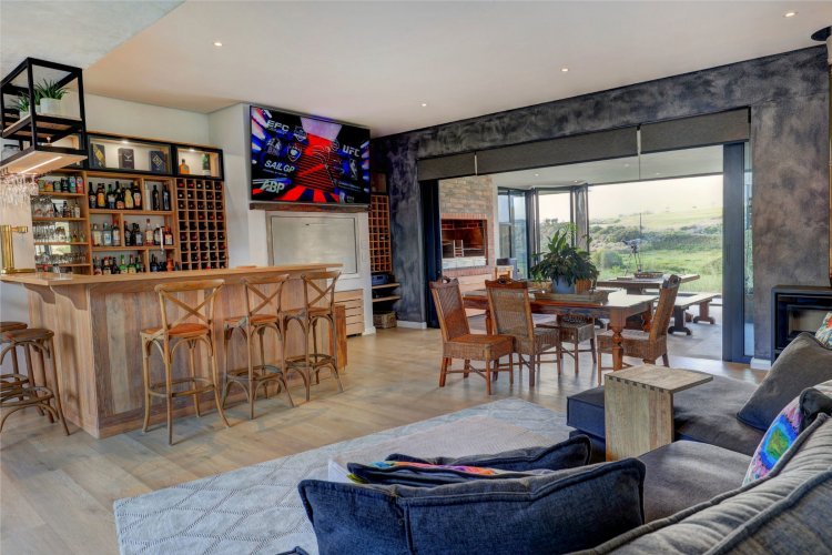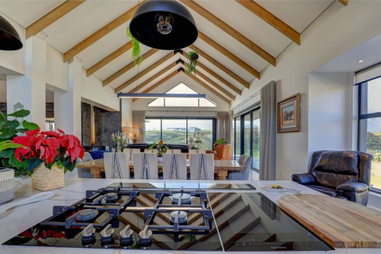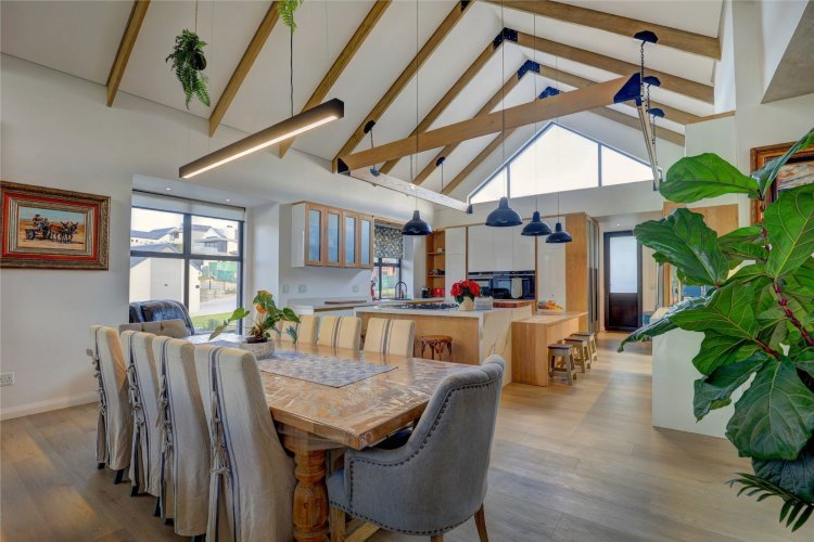 Open plan living areas with exposed trusses. Large family kitchen and dining room which flows into the living room. Indoor braai area and fitted bar opens onto the under cover outdoor braai area.