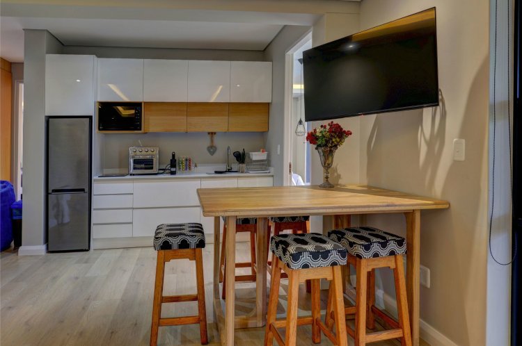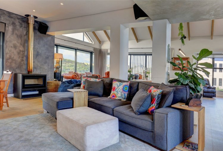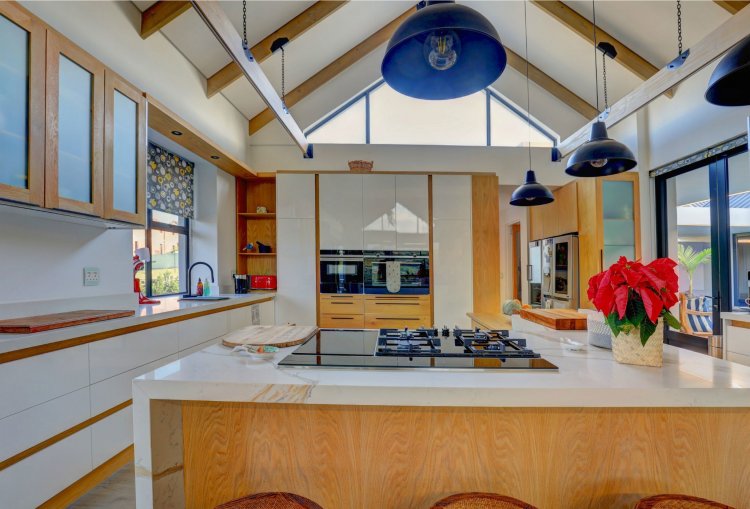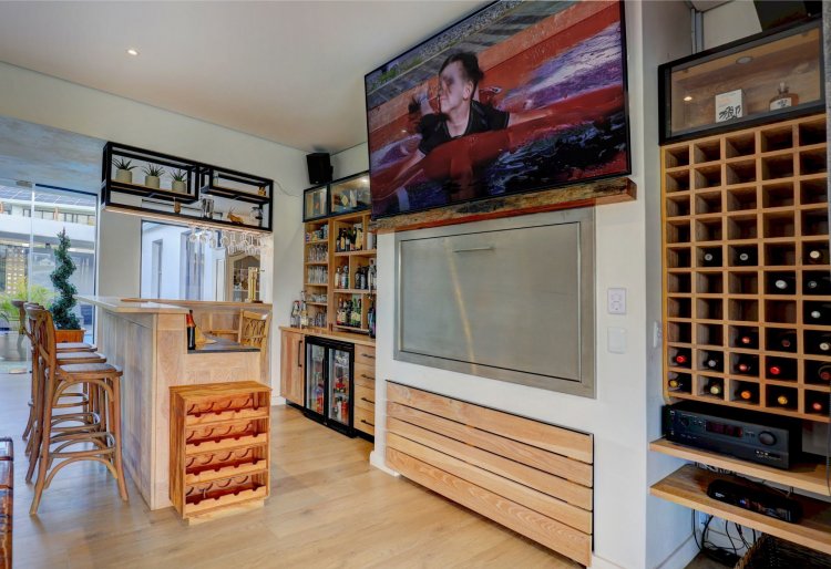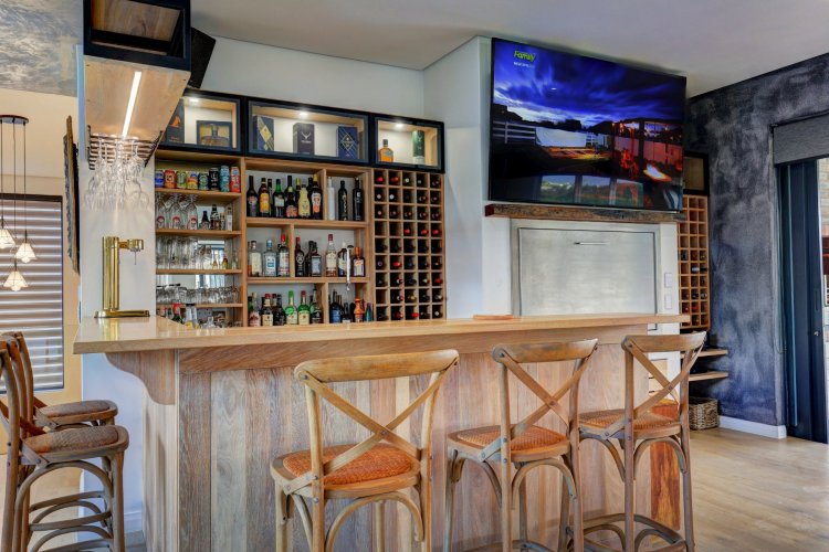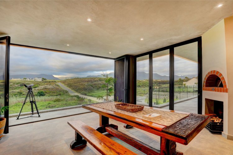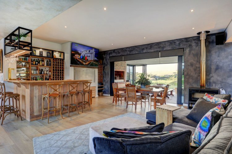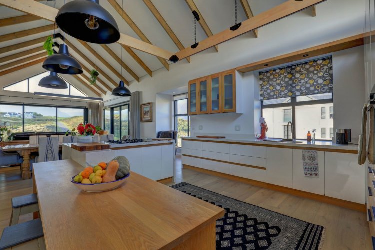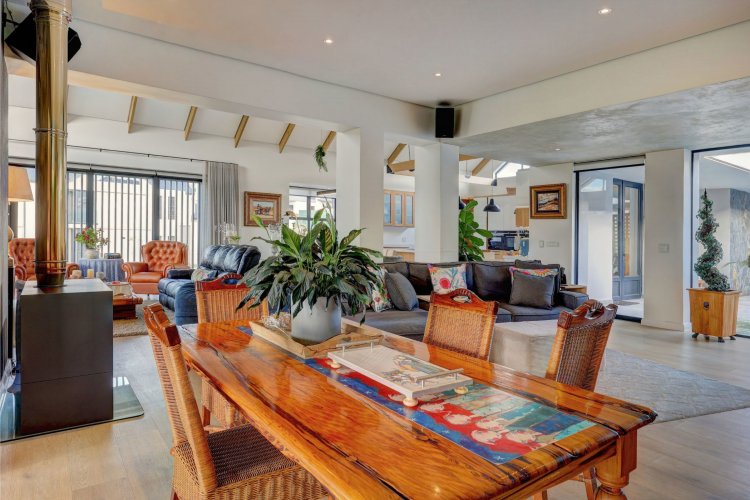 Open plan living areas with exposed trusses. Large family kitchen and dining room which flows into the living room. Indoor braai area and fitted bar opens onto the under cover outdoor braai area.