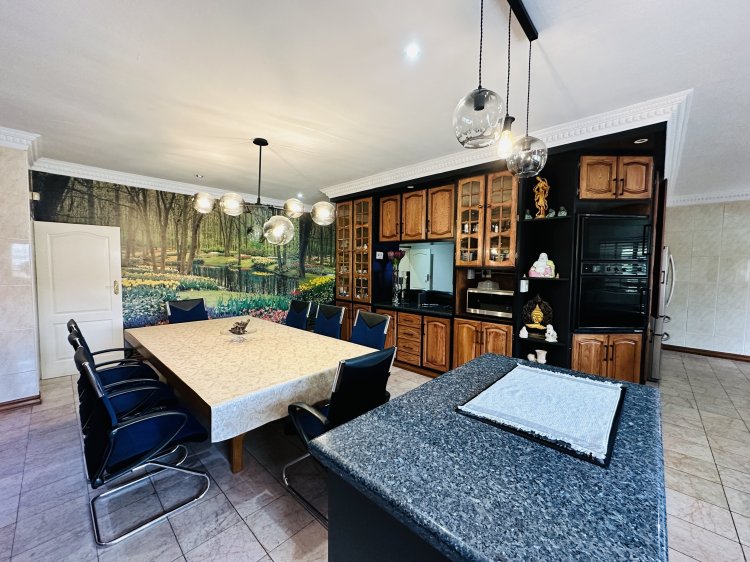 This exceptional family Gem offers unparalleled space, security, and entertainment areas, making it perfect for large families or those who love to entertain. With multiple living spaces, top notch security, and incredible outdoor features, this property is a must-see! Featuring spacious living areas with a grand entrance hall leading to a formal lounge and a large dining area. A massive entertainment room with air conditioning and sliding doors, perfect for hosting guests. The cozy lounge/TV room is ideal for family time. All this leads out to the patio & thatched lapa with built-in braai for outdoor entertaining.