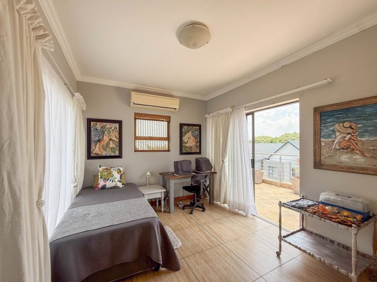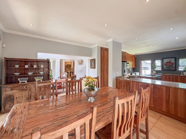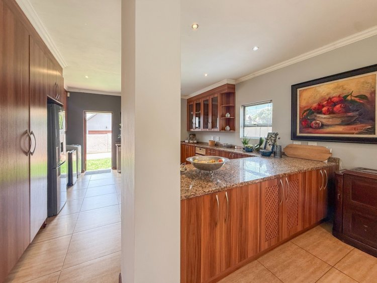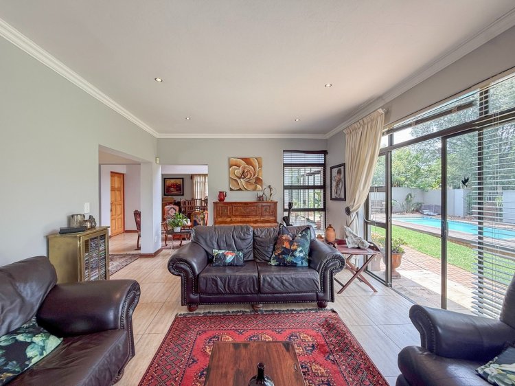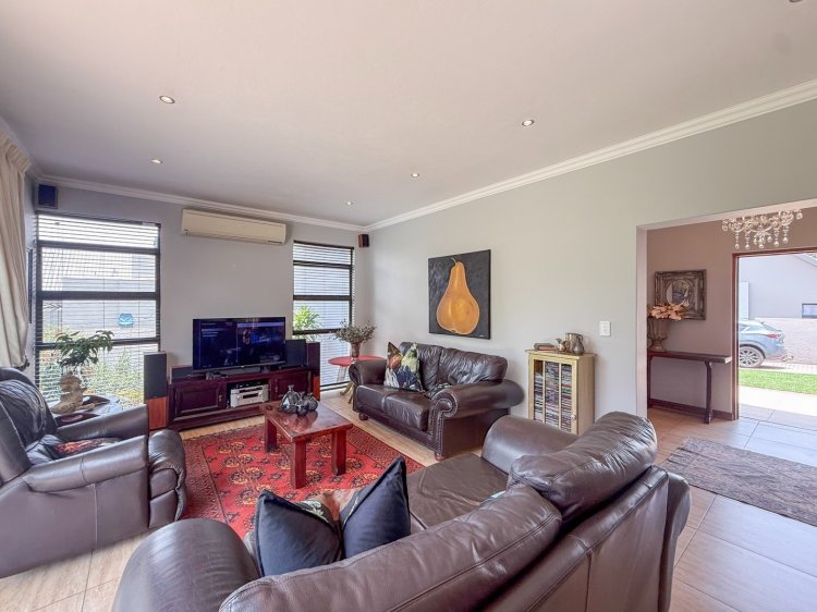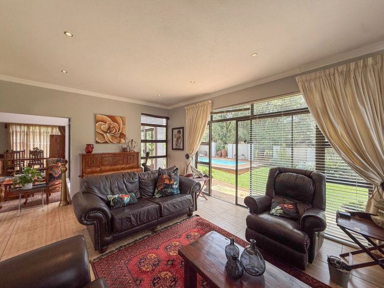 The entrance hall flows effortlessly into the dining area, contemporary kitchen with central island, and an enclosed patio featuring a built-in braai. Stacking doors open from the patio onto a sparkling swimming pool and neatly landscaped garden, creating an inviting space for entertaining or unwinding outdoors. A separate lounge provides a more private, cosy retreat while remaining well connected to the main living areas.