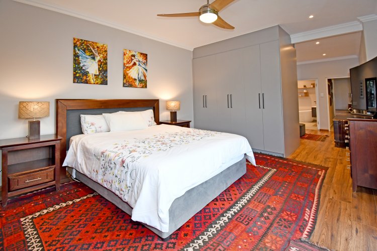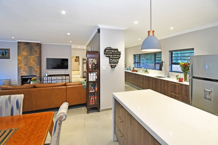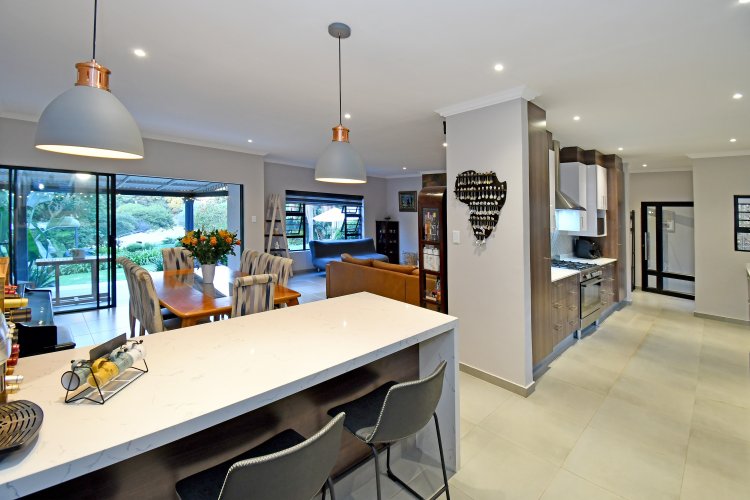 At the heart of the home lies a stunning contemporary kitchen, finished with sleek white granite countertops and a freestanding 5-plate AEG gas stove with electric oven. A breakfast counter, with additional cupboard space, connects to the living area, inviting casual family meals, while the separate scullery keeps the main kitchen pristine and organized.